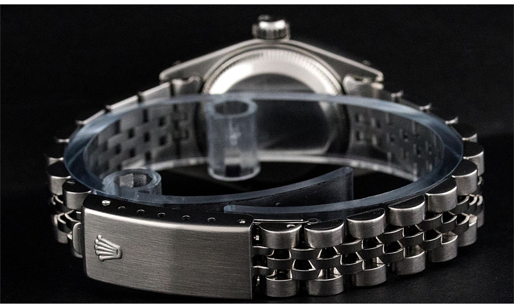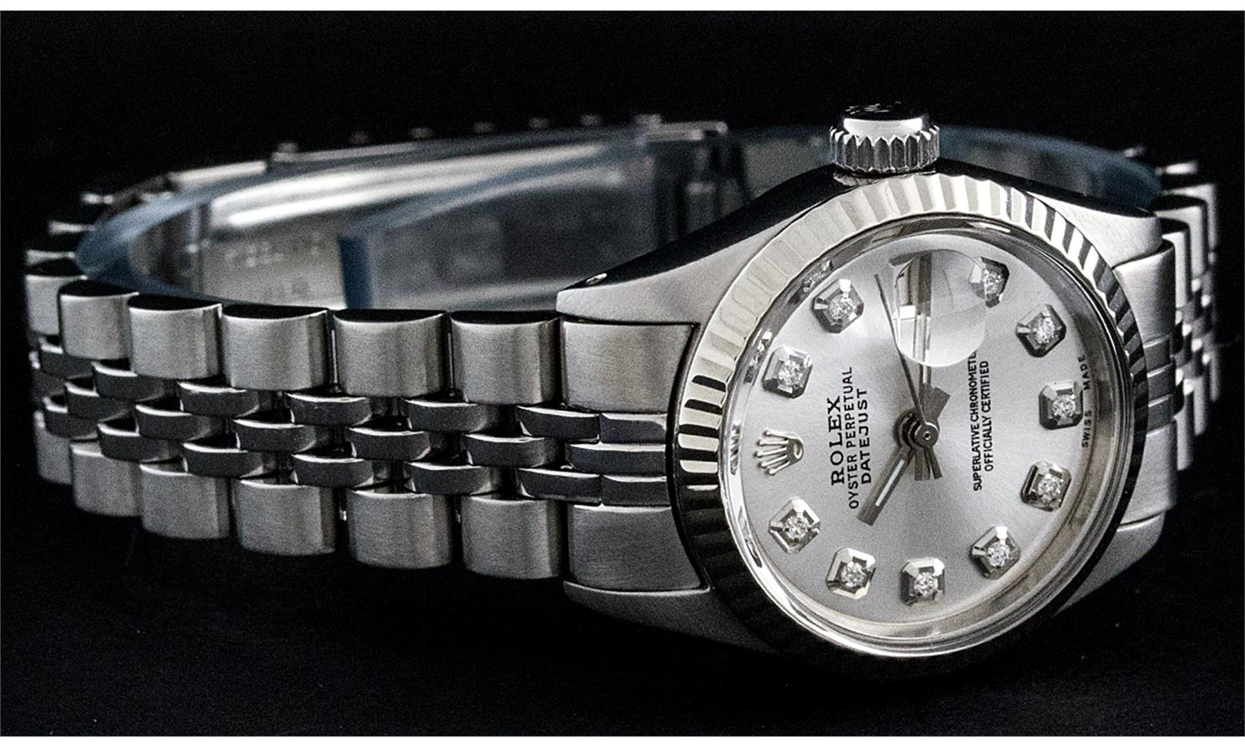 One Ladies Rolex Datejust Polished Bright with Satin Finish, Serviced & Electronically Tested, Stainless Steel Case:26mm, Stainless Steel Crown, Bezel: 14K White Gold Fluted. Custom Crystal: Acrylic Cyclops Lens. Movement: Automatic Winding Movement Caliber 2030. Custom Dial: Silver With Diamond Hour Markers, Diamond Count: 10 Diamonds, Clarity: SI-VS, Color: G to H. Date Window: 3 O'Clock Position Date Display, Model: Datejust. Condition: G-6 Extra Fine. Bracelet: Stainless Steel Jubilee Band. Bright Polish & Satin Finish. 6.0 Inch Length, Adjustable. Standard Clasp, With Rolex Logo. Comes with 6 month warranty.