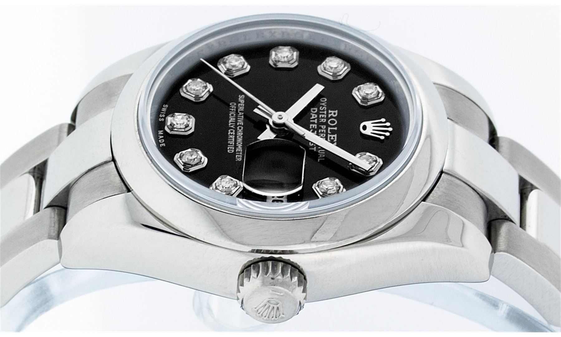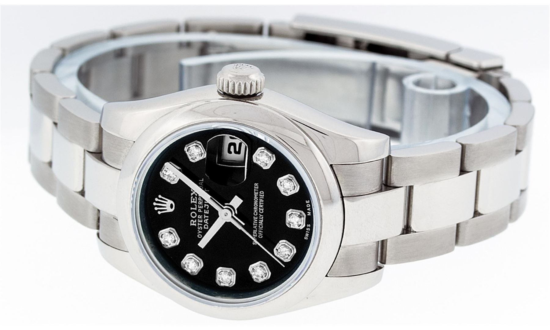 One Ladies Rolex Datejust Polished Bright with Satin Finish, Serviced & Electronically Tested, Stainless Steel Case:26mm, Stainless Steel Crown, Bezel: Stainless Steel Bezel. Custom Crystal: Synthetic Sapphire Cyclops Lens. Movement: Automatic Winding Movement Caliber 2235. Custom Dial: Refinished Black Diamond VVS, Diamond Count: 10 Diamonds in Dial G To H In Color, Clarity: VVS. Date Window: 3 O'Clock Position Date Display, Model: No Hole Quickset Datejust 179160. Condition: G-6 Extra Fine. Bracelet: Stainless Steel Oyster. Bright Polish & Satin Finish. 6.0 Inch Length, Adjustable. Standard Clasp, With Rolex Logo. Comes with 6 month warranty.