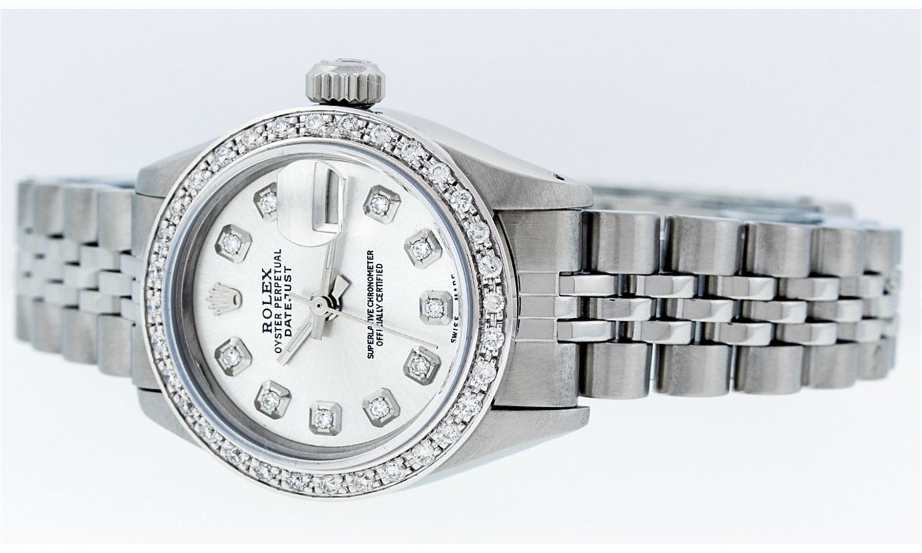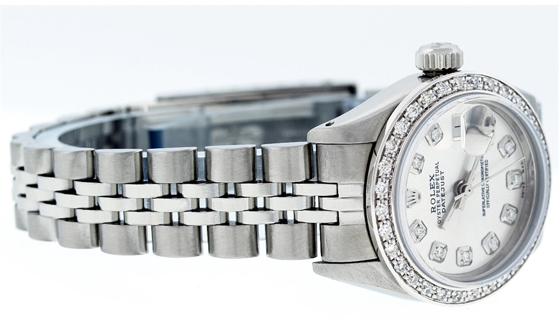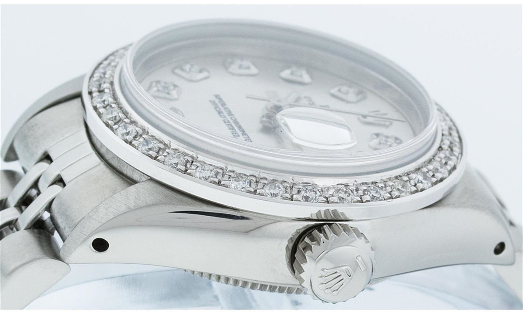 One Ladies Rolex Datejust Polished Bright with Satin Finish, Serviced & Electronically Tested, Stainless Steel Case:26mm, Stainless Steel Crown, Custom Bezel: 18K White Gold Beadset Diamond Bezel, Diamond Count: 32 Diamonds Total Weight .70 Carat, Clarity: SI-VS, Color: G to H. Custom Crystal: Synthetic Sapphire Cyclops Lens. Movement: Automatic Winding Movement Caliber 2030. Custom Dial: Silver Diamond Dial, Diamond Count: 10 Diamonds In Dial, Clarity: SI-VS, Color: G to H. Date Window: 3 O'Clock Position Date Display, Non Quickset, Model: Datejust Condition: G-6 Extra Fine. Bracelet: Stainless Steel Jubilee Band. Bright Polish & Satin Finish. 6.0 Inch Length, Adjustable. Standard Clasp, With Rolex Logo.