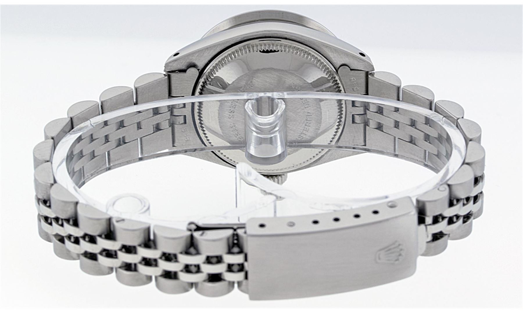 One Ladies Rolex Datejust Polished Bright with Satin Finish, Serviced & Electronically Tested, Stainless Steel Case:26mm, Stainless Steel Crown, Diamond Lugs: 16 Diamonds On Lugs, Clarity: SI-VS, Color: G to H. Custom Bezel: 18K White Gold Beadset Diamond Bezel, Diamond Count: 32 Diamonds Total Weight 1.00 Carat, Clarity: SI-VS, Color: G to H. Custom Crystal: Synthetic Sapphire Cyclops Lens. Movement: Automatic Winding Movement Caliber 2030. Custom Dial: Refinished Black With String Diamond Dial, 43 Diamonds in Dial G To H In Color, Clarity: SI-VS. Date Window: 3 O'Clock Position Date Display, Non Quickset, Model: Datejust. Condition: G-6 Extra Fine. Bracelet: Stainless Steel Jubilee. Bright Polish & Satin Finish. 6.0 Inch Length, Adjustable. Standard Clasp, With Rolex Logo.