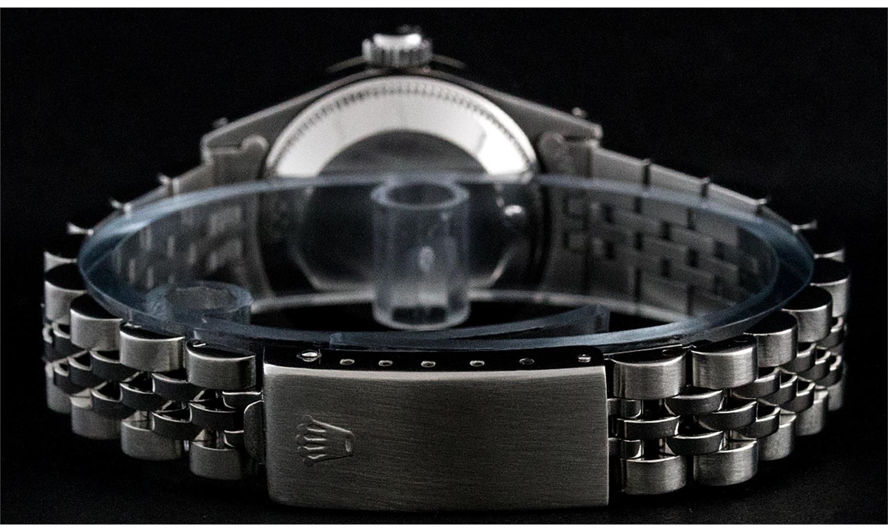 One Ladies Rolex Datejust Polished Bright with Satin Finish, Serviced & Electronically Tested, Stainless Steel Case:26mm, Stainless Steel Crown, Bezel: 14K White Gold Fluted. Custom Crystal: Acrylic Cyclops Lens. Movement: Automatic Winding Movement Caliber 2030. Custom Dial: Silver With Diamond Hour Markers, Diamond Count: 10 Diamonds, Clarity: SI-VS, Color: G to H. Date Window: 3 O'Clock Position Date Display, Model: Datejust. Condition: G-6 Extra Fine. Bracelet: Stainless Steel Jubilee Band. Bright Polish & Satin Finish. 6.0 Inch Length, Adjustable. Standard Clasp, With Rolex Logo. Comes with 6 month warranty.