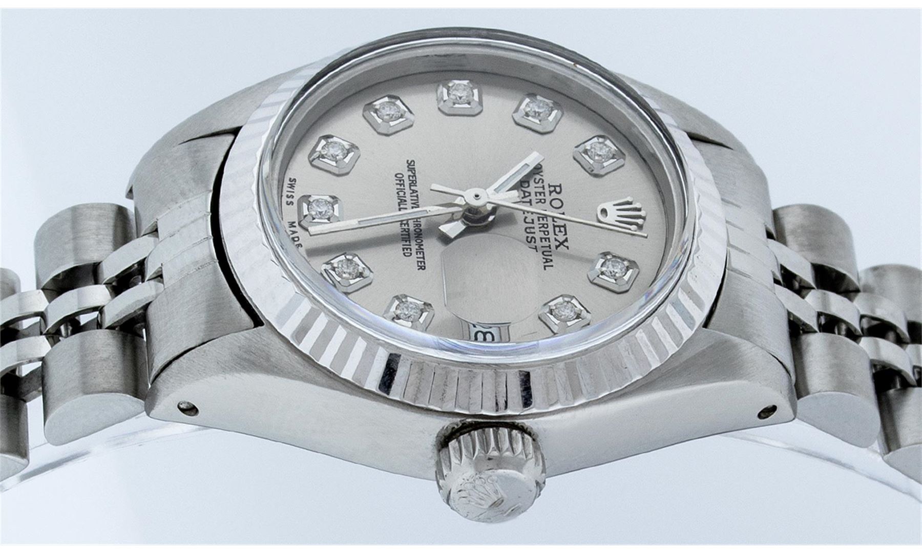 One Ladies Rolex Datejust Polished Bright with Satin Finish, Serviced & Electronically Tested, Stainless Steel Case:26mm, Stainless Steel Crown, Bezel: 14K White Gold Fluted. Custom Crystal: Acrylic Cyclops Lens. Movement: Automatic Winding Movement Caliber 2030. Custom Dial: Slate Grey With Diamond Hour Markers, Diamond Count: 10 Diamonds, Clarity: SI-VS, Color: G to H. Date Window: 3 O'Clock Position Date Display, Model: Datejust. Condition: G-6 Extra Fine. Bracelet: Stainless Steel Jubilee Band. Bright Polish & Satin Finish. 6.0 Inch Length, Adjustable. Standard Clasp, With Rolex Logo. Comes with 6 month warranty.