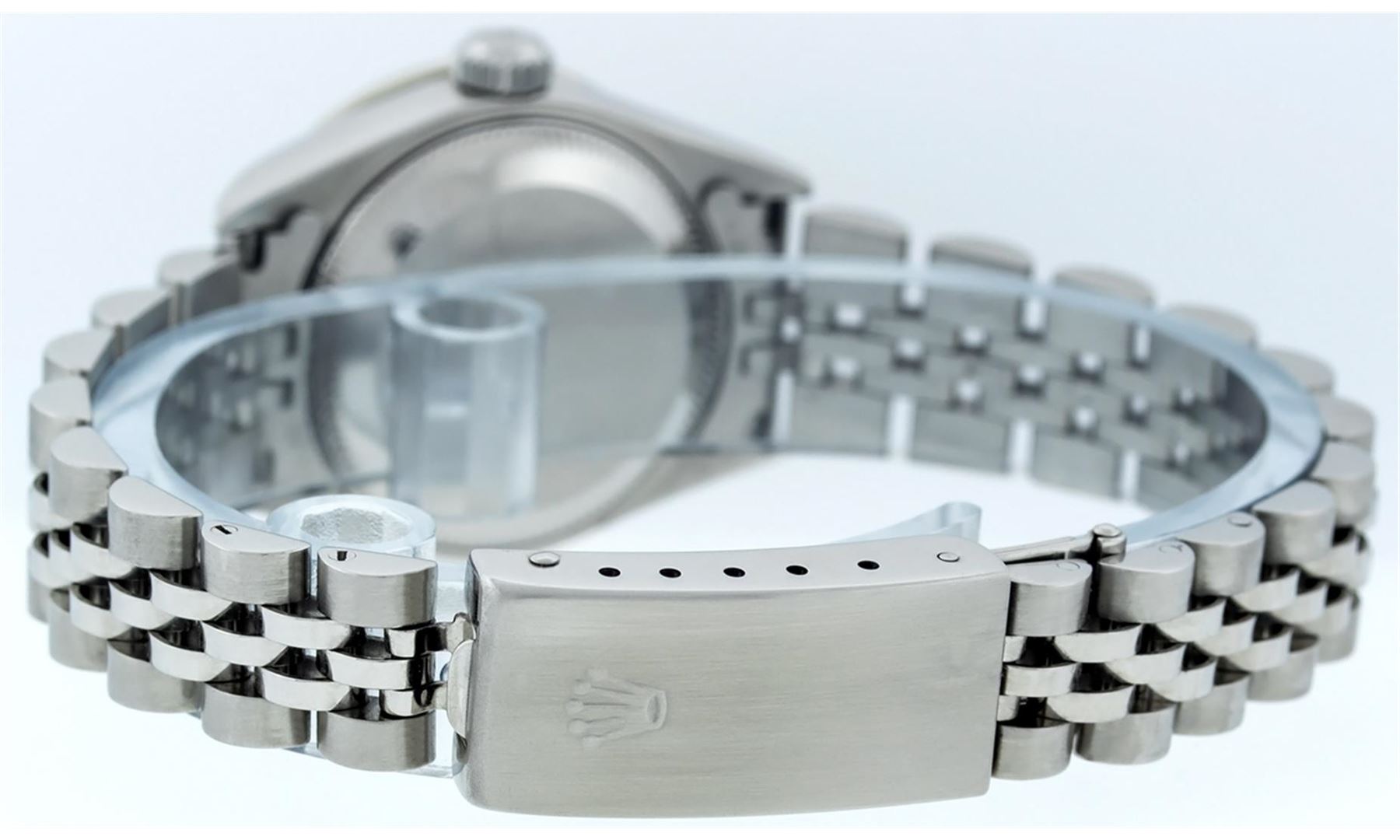 One Ladies Stainless Steel Rolex Datejust Polished Bright with Satin Finish, Serviced & Electronically Tested, Stainless Steel Case:26mm, Stainless Steel Crown, Diamond Lugs: 16 Diamonds On Lugs, Clarity: SI-VS, Color: G to H. Custom Bezel: Stainless Steel Beadset Bezel, Diamond Count: 40 Diamonds, Total Weight 1.00 Carat, Clarity: SI-VS, Color: G to H. Custom Crystal: Synthetic Sapphire Cyclops Lens. Movement: Automatic Winding Movement Caliber 2235. Custom Dial: Refinished Mother Of Pearl With String Diamond Dial VVS, 43 Diamonds in Dial G To H In Color, Clarity: VVS. Date Window: 3 O'Clock Position Date Display, Model: No Hole Datejust Quickset. Condition: G-6 Extra Fine The Watch Is In Very Good Condition Free Of All Scratches And Dents. . Bracelet: Stainless Steel Jubilee Band. Bright Polish & Satin Finish. 6.0 Inch Length, Adjustable. Standard Clasp, With Rolex Logo.