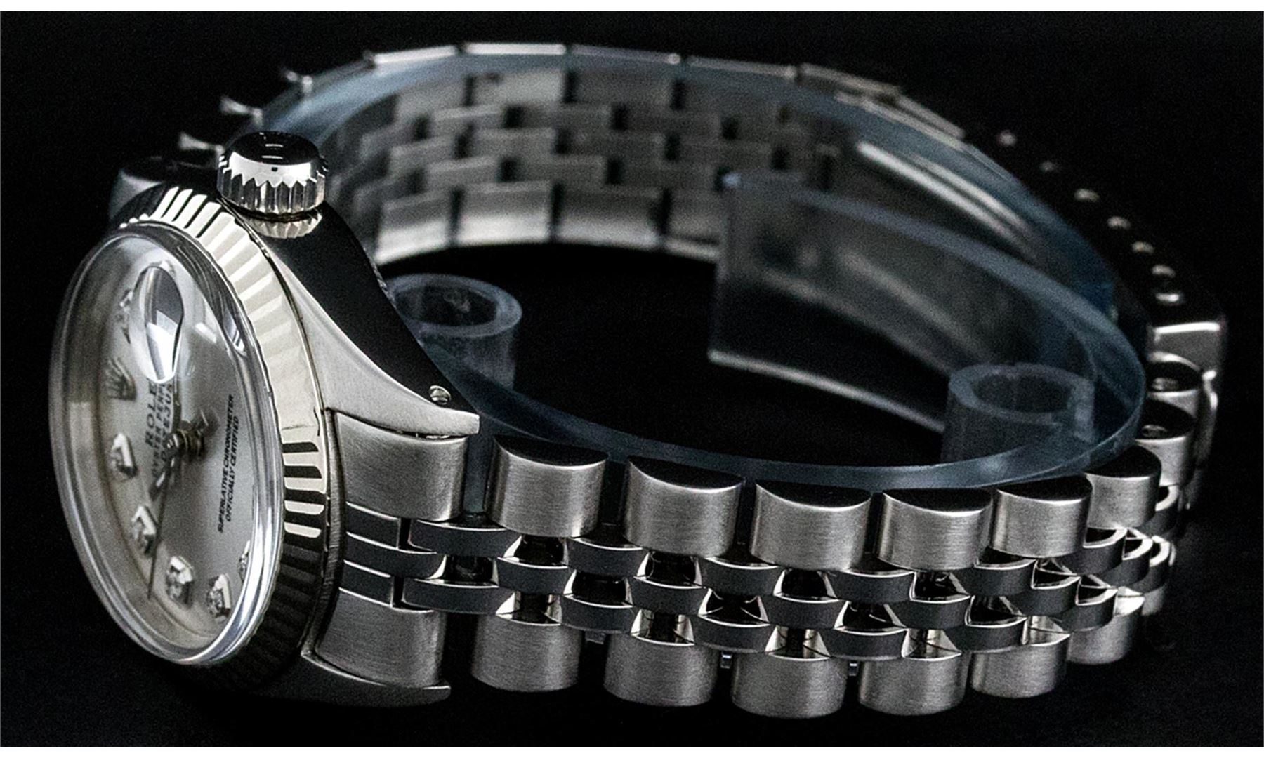 One Ladies Rolex Datejust Polished Bright with Satin Finish, Serviced & Electronically Tested, Stainless Steel Case:26mm, Stainless Steel Crown, Bezel: 14K White Gold Fluted. Custom Crystal: Acrylic Cyclops Lens. Movement: Automatic Winding Movement Caliber 2030. Custom Dial: Silver With Diamond Hour Markers, Diamond Count: 10 Diamonds, Clarity: SI-VS, Color: G to H. Date Window: 3 O'Clock Position Date Display, Model: Datejust. Condition: G-6 Extra Fine. Bracelet: Stainless Steel Jubilee Band. Bright Polish & Satin Finish. 6.0 Inch Length, Adjustable. Standard Clasp, With Rolex Logo. Comes with 6 month warranty.