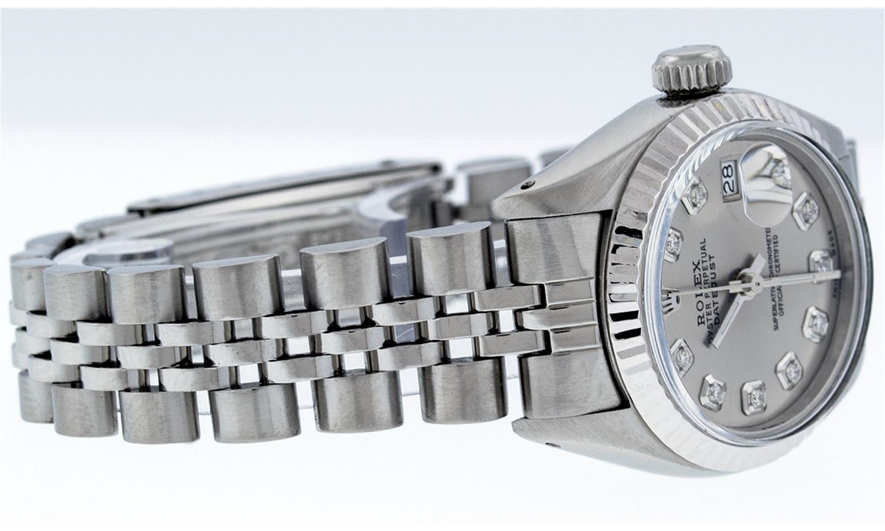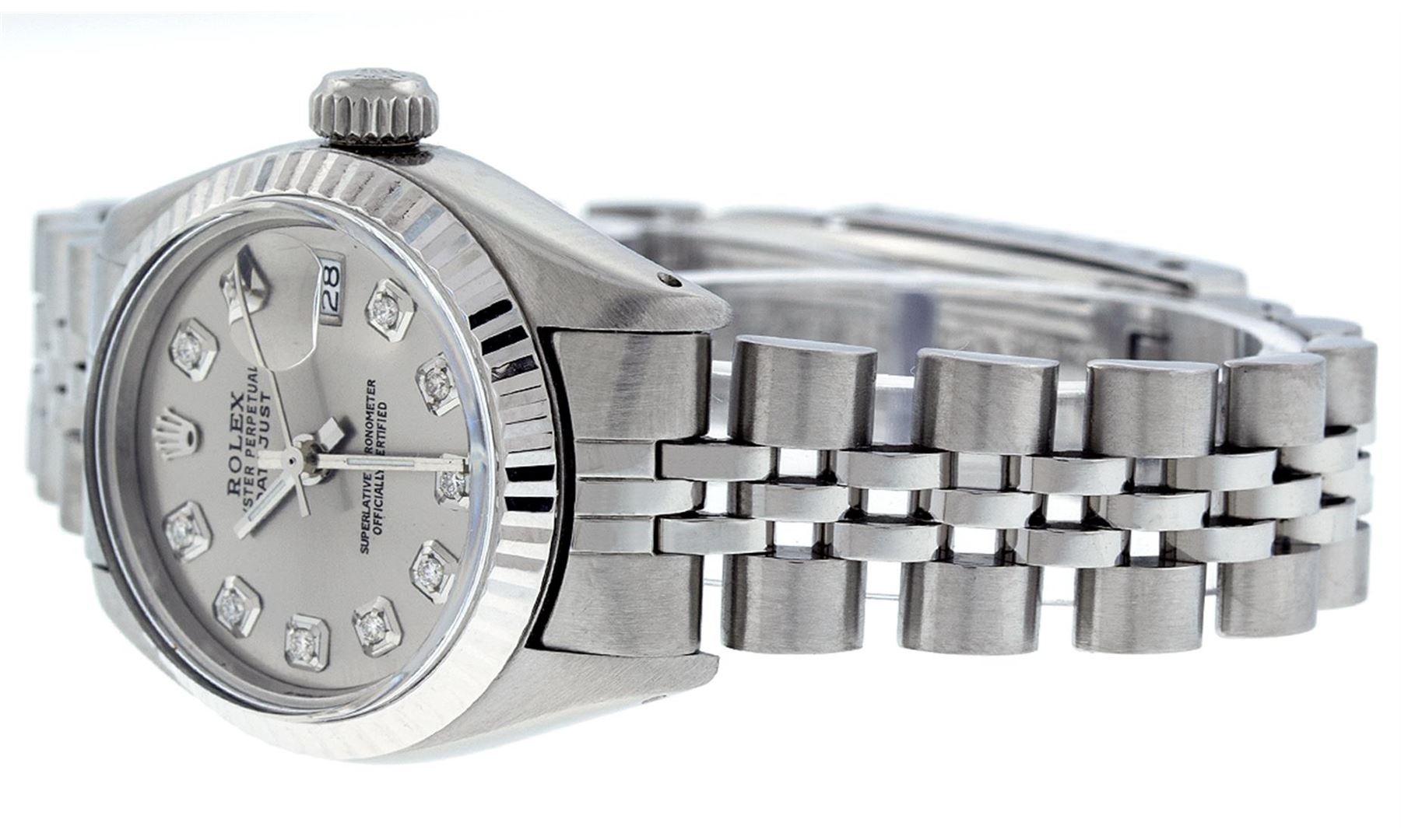 One Ladies Rolex Datejust Polished Bright with Satin Finish, Serviced & Electronically Tested, Stainless Steel Case:26mm, Stainless Steel Crown, Bezel: 14K White Gold Fluted. Custom Crystal: Acrylic Cyclops Lens. Movement: Automatic Winding Movement Caliber 2030. Custom Dial: Slate Grey With Diamond Hour Markers, Diamond Count: 10 Diamonds, Clarity: SI-VS, Color: G to H. Date Window: 3 O'Clock Position Date Display, Model: Datejust. Condition: G-6 Extra Fine. Bracelet: Stainless Steel Jubilee Band. Bright Polish & Satin Finish. 6.0 Inch Length, Adjustable. Standard Clasp, With Rolex Logo. Comes with 6 month warranty.