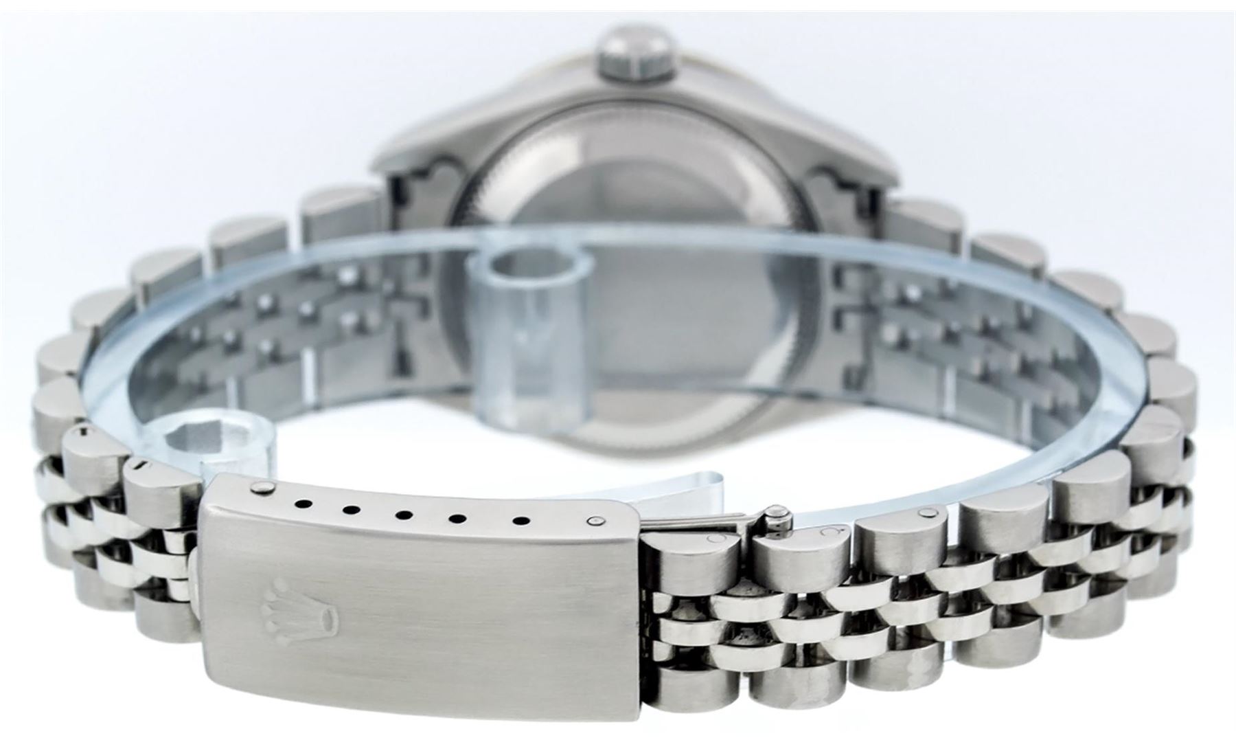 One Ladies Stainless Steel Rolex Datejust Polished Bright with Satin Finish, Serviced & Electronically Tested, Stainless Steel Case:26mm, Stainless Steel Crown, Diamond Lugs: 16 Diamonds On Lugs, Clarity: SI-VS, Color: G to H. Custom Bezel: Stainless Steel Beadset Bezel, Diamond Count: 40 Diamonds, Total Weight 1.00 Carat, Clarity: SI-VS, Color: G to H. Custom Crystal: Synthetic Sapphire Cyclops Lens. Movement: Automatic Winding Movement Caliber 2235. Custom Dial: Refinished Mother Of Pearl With String Diamond Dial VVS, 43 Diamonds in Dial G To H In Color, Clarity: VVS. Date Window: 3 O'Clock Position Date Display, Model: No Hole Datejust Quickset. Condition: G-6 Extra Fine The Watch Is In Very Good Condition Free Of All Scratches And Dents. . Bracelet: Stainless Steel Jubilee Band. Bright Polish & Satin Finish. 6.0 Inch Length, Adjustable. Standard Clasp, With Rolex Logo.