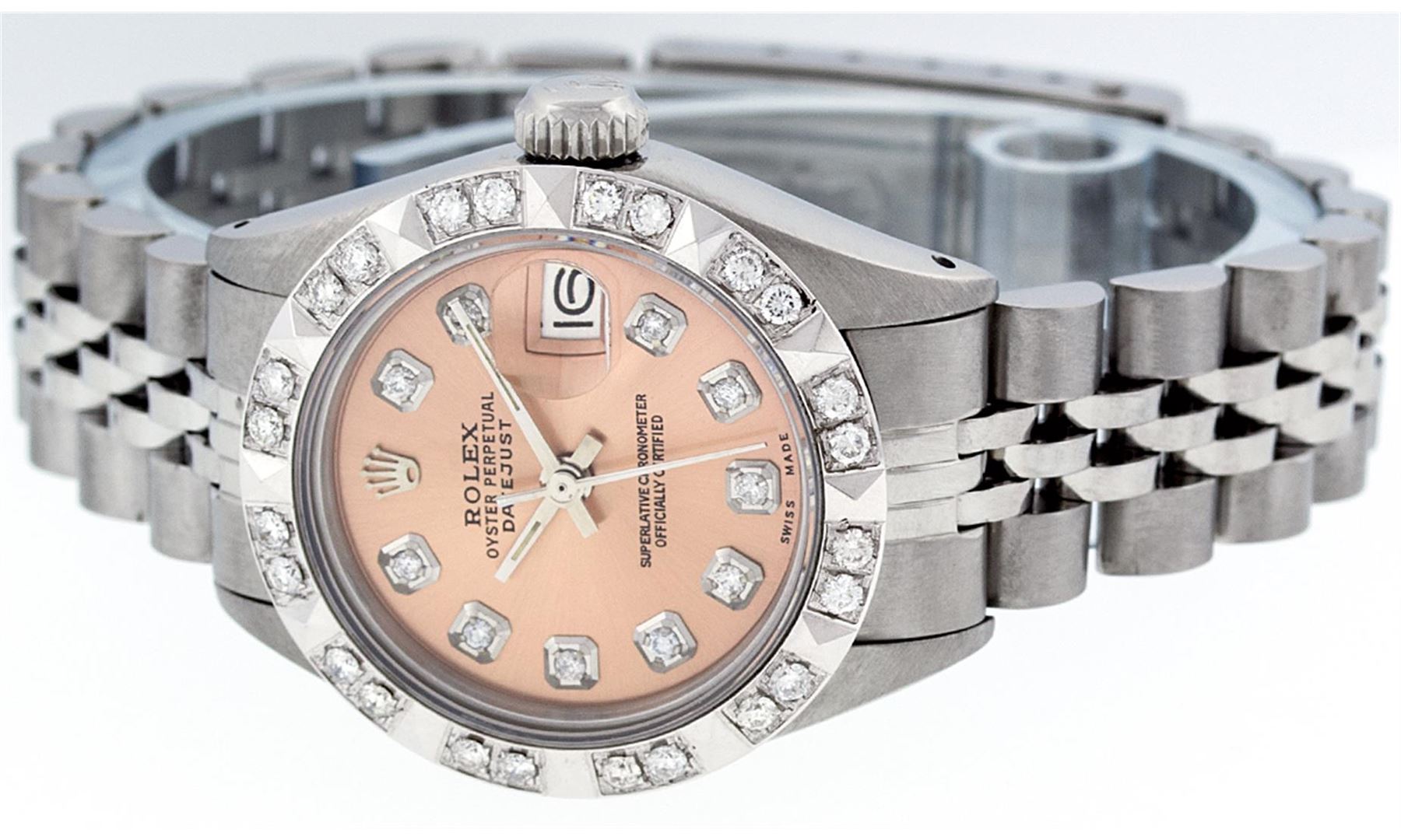One Ladies Rolex Datejust Polished Bright with Satin Finish, Serviced & Electronically Tested, Stainless Steel Case:26mm, Stainless Steel Crown, Custom Bezel: 18K White Gold Pyramid Diamond Bezel, Diamond Count: 24 Diamonds In Dial. Total Weight .50 Carat, Clarity: SI-VS, Color: G to H. Custom Crystal: Synthetic Sapphire Cyclops Lens. Movement: Automatic Winding Movement Caliber 2030. Custom Dial: Salmon Diamond Dial. Diamond Count: 10 Diamonds In Dial. Clarity: SI-VS, Color: G to H. Date Window: 3 O'Clock Position Date Display, Model: Datejust. Condition: G-6 Extra Fine The Watch Is In Very Good Condition Free Of All Scratches And Dents. . Bracelet: Stainless Steel Jubilee Band With Rolex Crown On Buckle. Bright Polish & Satin Finish. Band Length: 6.0 Inch Length, Adjustable. Standard Clasp, With Rolex Logo.