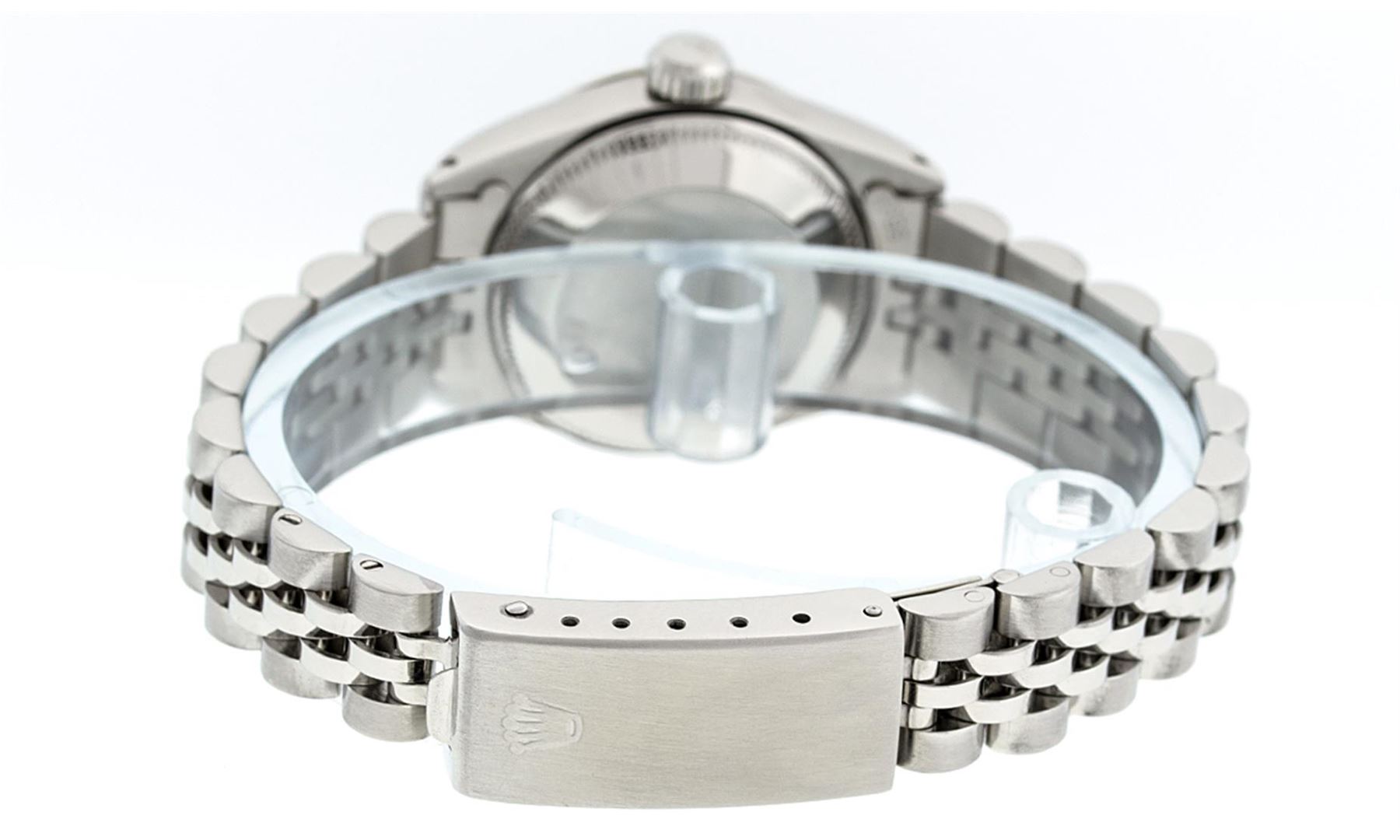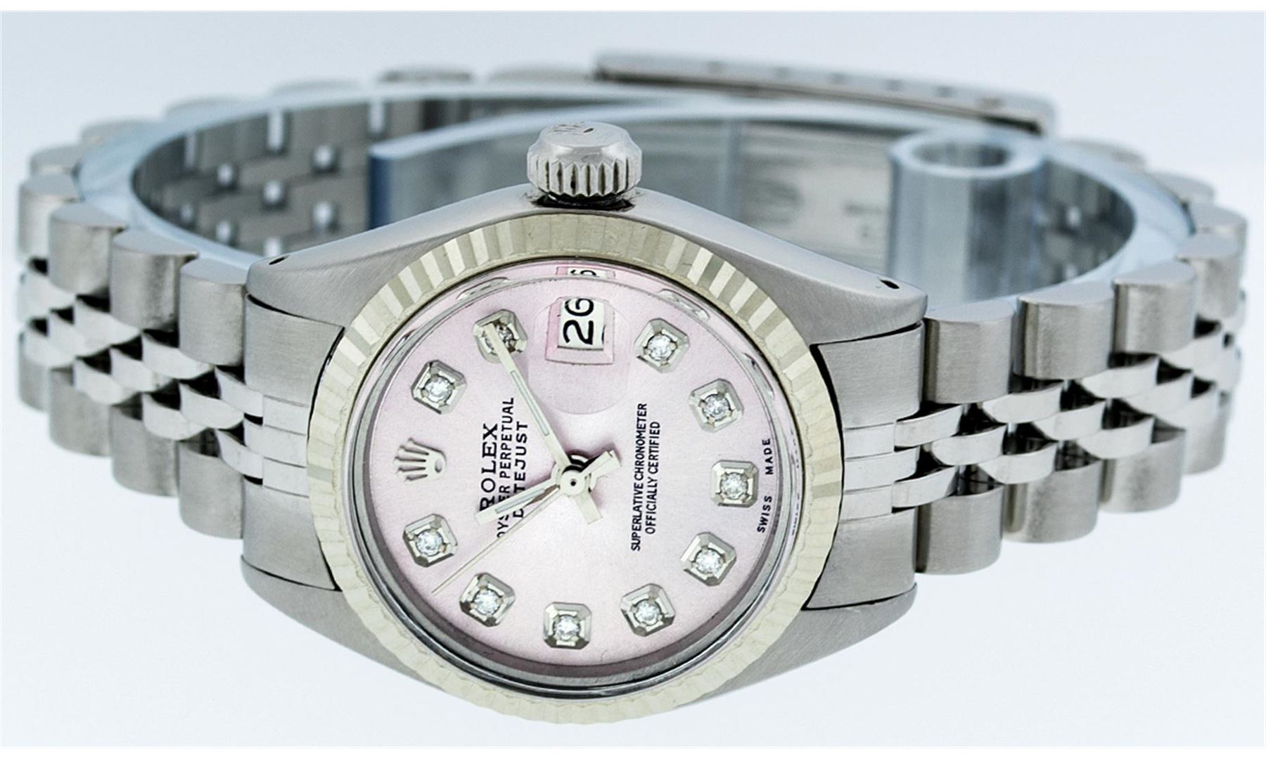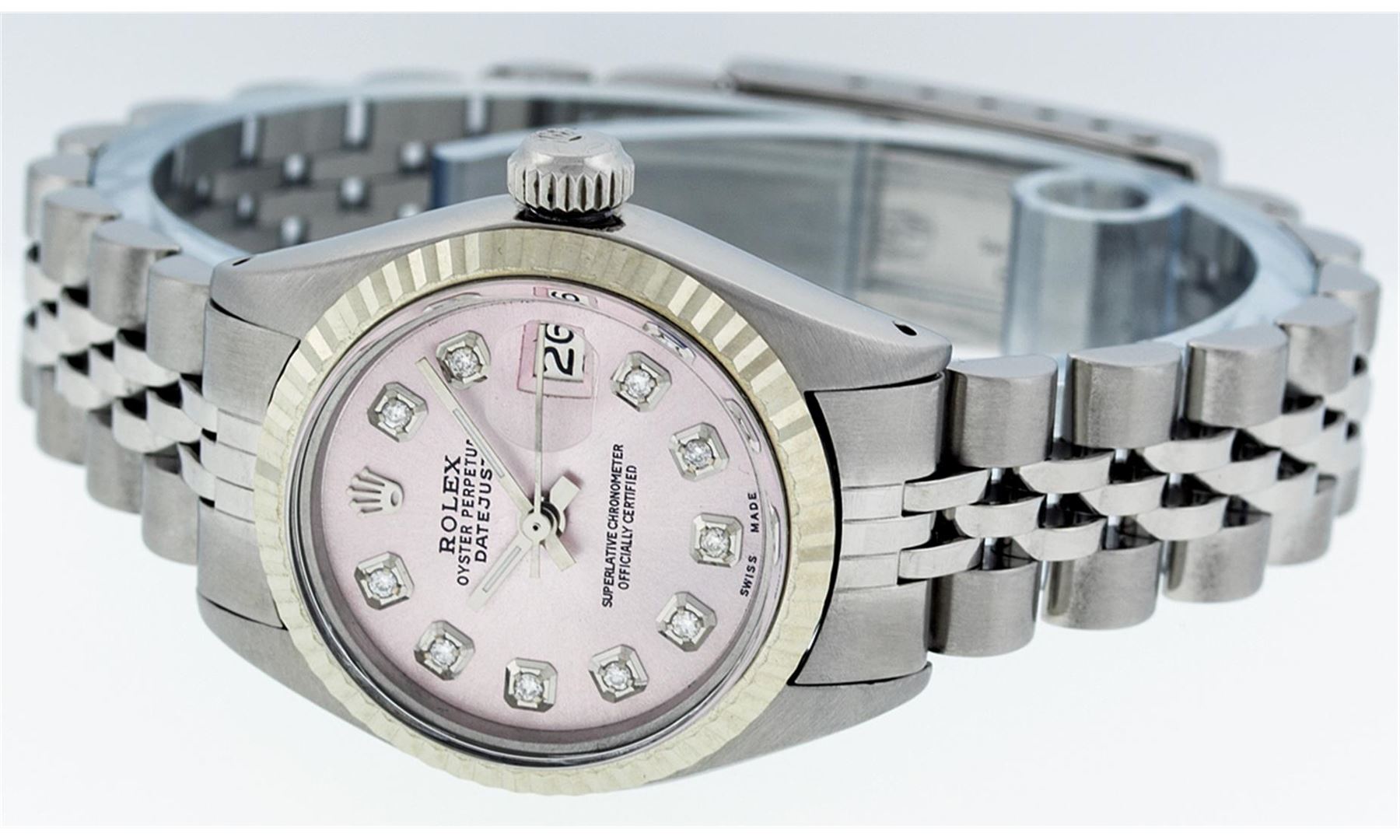 One Ladies Rolex Datejust Polished Bright with Satin Finish, Serviced & Electronically Tested, Stainless Steel Case:26mm, Stainless Steel Crown, Bezel: 14K Fluted Bezel. Custom Crystal: Acrylic Cyclops Lens. Movement: Automatic Winding Movement Caliber 2030. Dial: Ice Pink Diamond Dial. Diamond Count: 10 Diamonds In Dial, Color: G to H, Clarity: SI-VS. Date Window: 3 O'Clock Position Date Display, Model: Datejust. Condition: G-6 Extra Fine. Bracelet: Stainless Steel Jubilee Band. Bright Polish & Satin Finish. 6.0 Inch Length, Adjustable. Standard Clasp, With Rolex Logo. Comes with 6 month warranty.