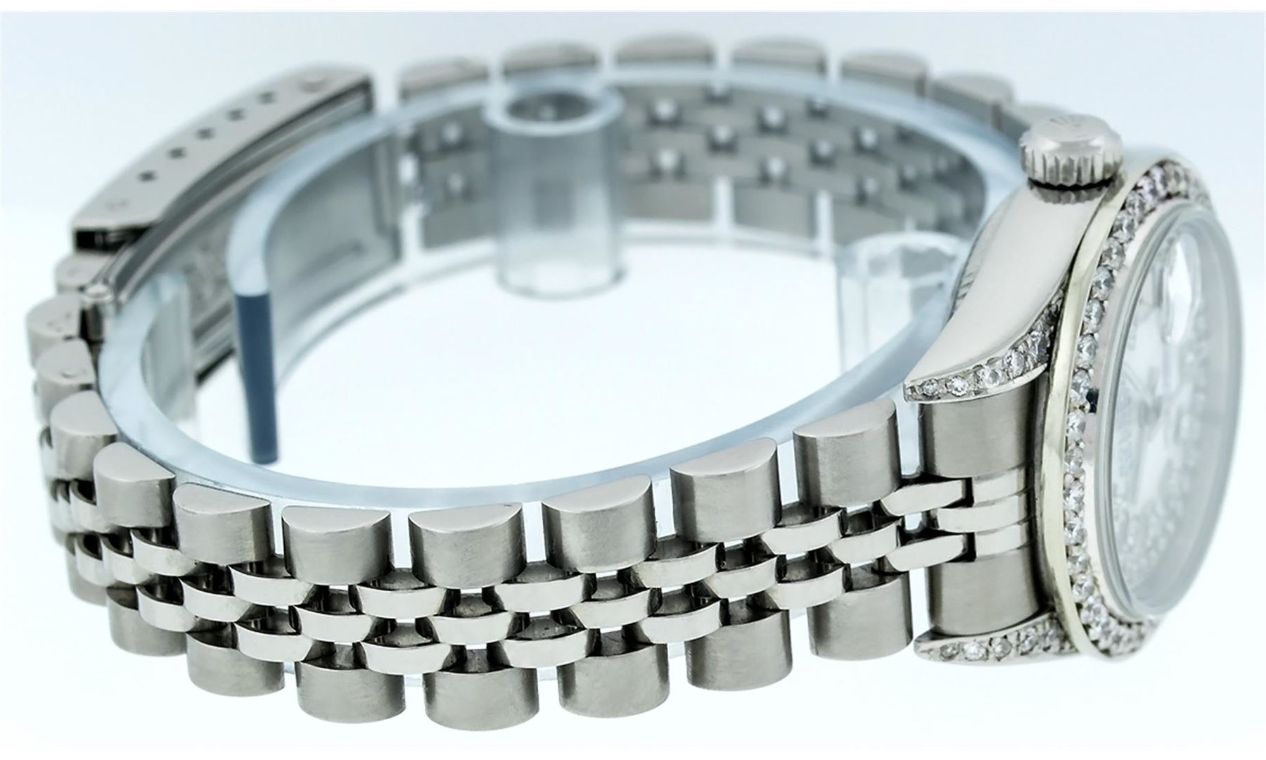 One Ladies Stainless Steel Rolex Datejust Polished Bright with Satin Finish, Serviced & Electronically Tested, Stainless Steel Case:26mm, Stainless Steel Crown, Diamond Lugs: 16 Diamonds On Lugs, Clarity: SI-VS, Color: G to H. Custom Bezel: Stainless Steel Beadset Bezel, Diamond Count: 40 Diamonds, Total Weight 1.00 Carat, Clarity: SI-VS, Color: G to H. Custom Crystal: Synthetic Sapphire Cyclops Lens. Movement: Automatic Winding Movement Caliber 2235. Custom Dial: Refinished Mother Of Pearl With String Diamond Dial VVS, 43 Diamonds in Dial G To H In Color, Clarity: VVS. Date Window: 3 O'Clock Position Date Display, Model: No Hole Datejust Quickset. Condition: G-6 Extra Fine The Watch Is In Very Good Condition Free Of All Scratches And Dents. . Bracelet: Stainless Steel Jubilee Band. Bright Polish & Satin Finish. 6.0 Inch Length, Adjustable. Standard Clasp, With Rolex Logo.