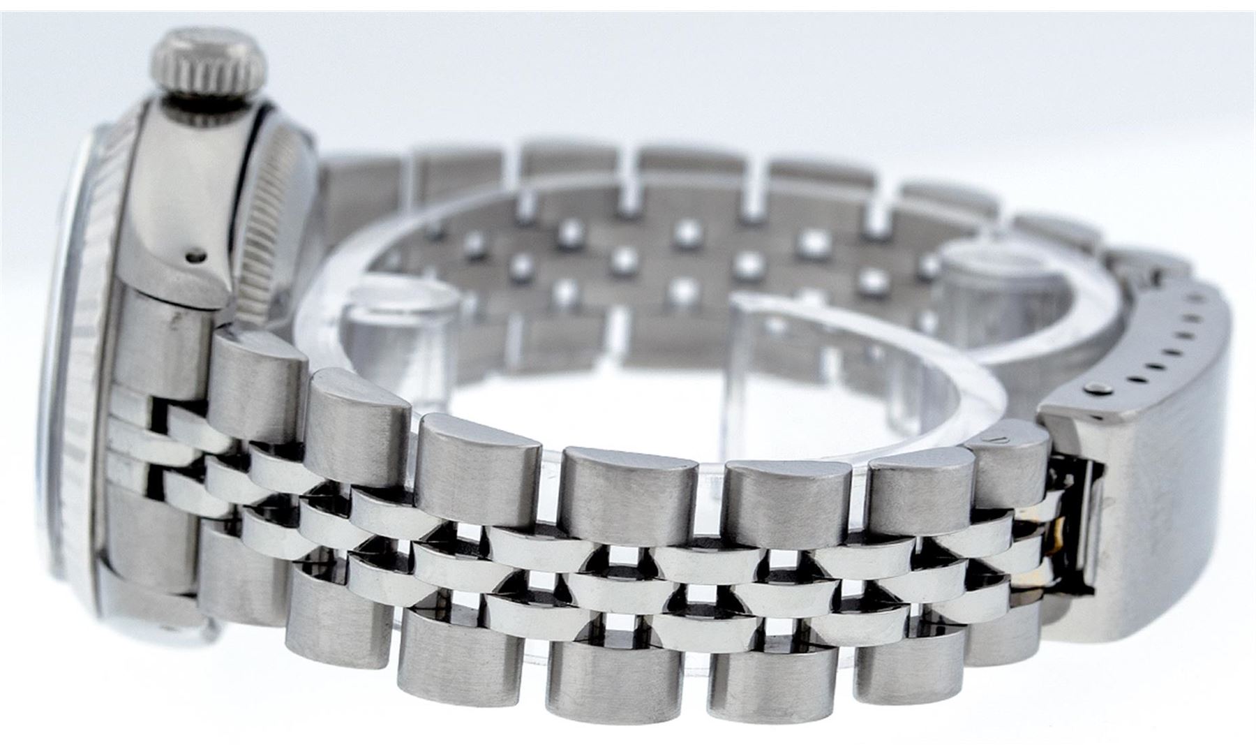 One Ladies Rolex Datejust Polished Bright with Satin Finish, Serviced & Electronically Tested, Stainless Steel Case:26mm, Stainless Steel Crown, Bezel: 14K White Gold Fluted. Custom Crystal: Acrylic Cyclops Lens. Movement: Automatic Winding Movement Caliber 2030. Custom Dial: Slate Grey With Diamond Hour Markers, Diamond Count: 10 Diamonds, Clarity: SI-VS, Color: G to H. Date Window: 3 O'Clock Position Date Display, Model: Datejust. Condition: G-6 Extra Fine. Bracelet: Stainless Steel Jubilee Band. Bright Polish & Satin Finish. 6.0 Inch Length, Adjustable. Standard Clasp, With Rolex Logo. Comes with 6 month warranty.