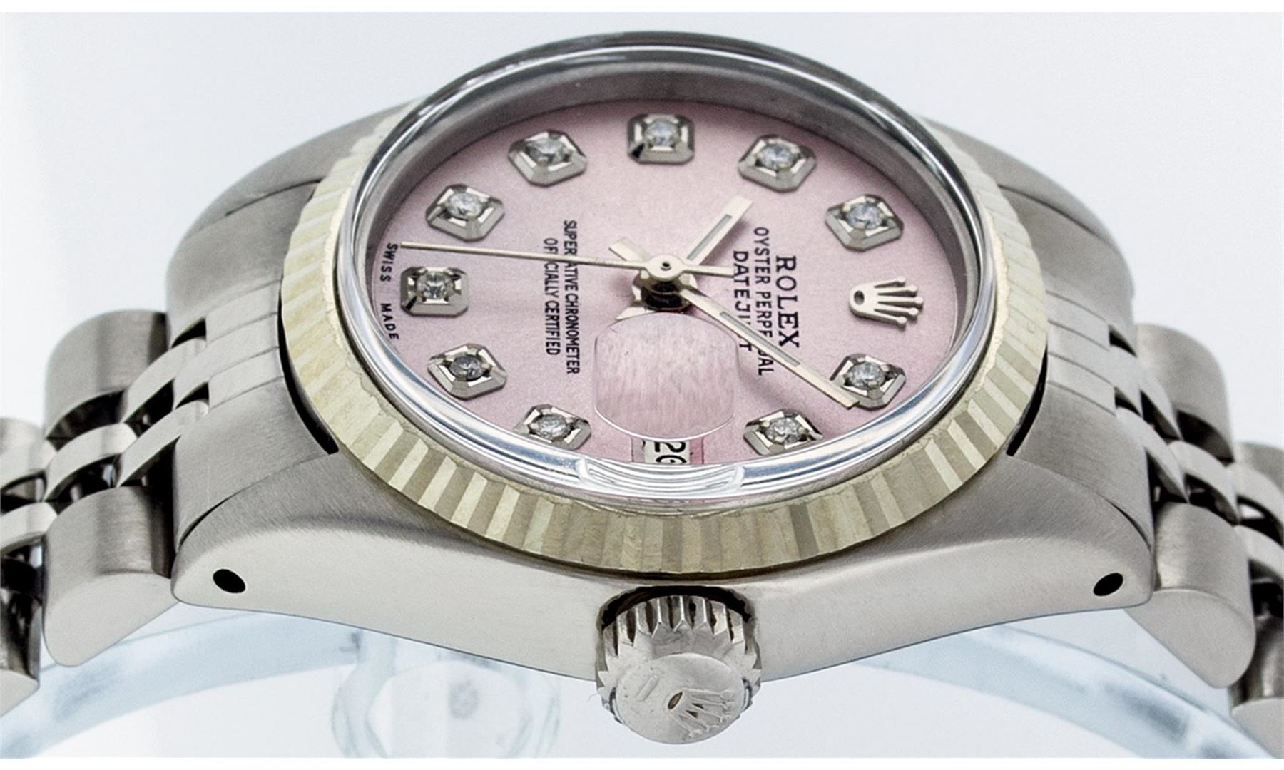 One Ladies Rolex Datejust Polished Bright with Satin Finish, Serviced & Electronically Tested, Stainless Steel Case:26mm, Stainless Steel Crown, Bezel: 14K Fluted Bezel. Custom Crystal: Acrylic Cyclops Lens. Movement: Automatic Winding Movement Caliber 2030. Dial: Ice Pink Diamond Dial. Diamond Count: 10 Diamonds In Dial, Color: G to H, Clarity: SI-VS. Date Window: 3 O'Clock Position Date Display, Model: Datejust. Condition: G-6 Extra Fine. Bracelet: Stainless Steel Jubilee Band. Bright Polish & Satin Finish. 6.0 Inch Length, Adjustable. Standard Clasp, With Rolex Logo. Comes with 6 month warranty.