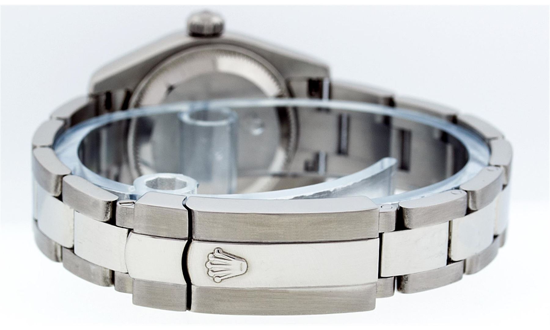 One Ladies Rolex Datejust Polished Bright with Satin Finish, Serviced & Electronically Tested, Stainless Steel Case:26mm, Stainless Steel Crown, Bezel: Stainless Steel Bezel. Custom Crystal: Synthetic Sapphire Cyclops Lens. Movement: Automatic Winding Movement Caliber 2235. Custom Dial: Refinished Green Vignette Diamond VVS, Diamond Count: 10 Diamonds in Dial G To H In Color, Clarity: VVS. Date Window: 3 O'Clock Position Date Display, Model: No Hole Datejust 179160. Condition: G-6 Extra Fine. Bracelet: Stainless Steel Oyster. Bright Polish & Satin Finish. 6.0 Inch Length, Adjustable. Standard Clasp, With Rolex Logo. Comes with 6 month warranty.
