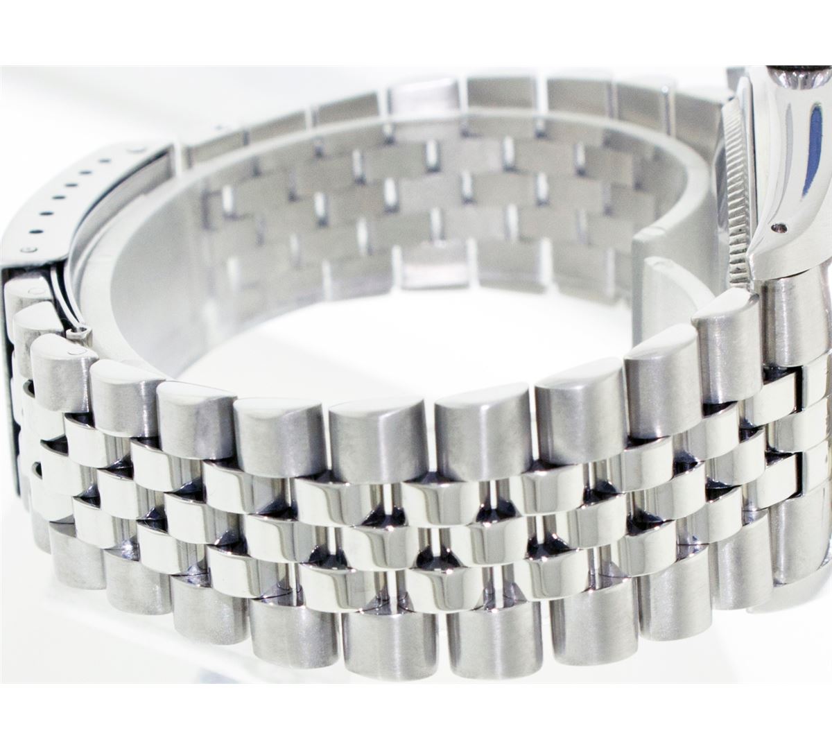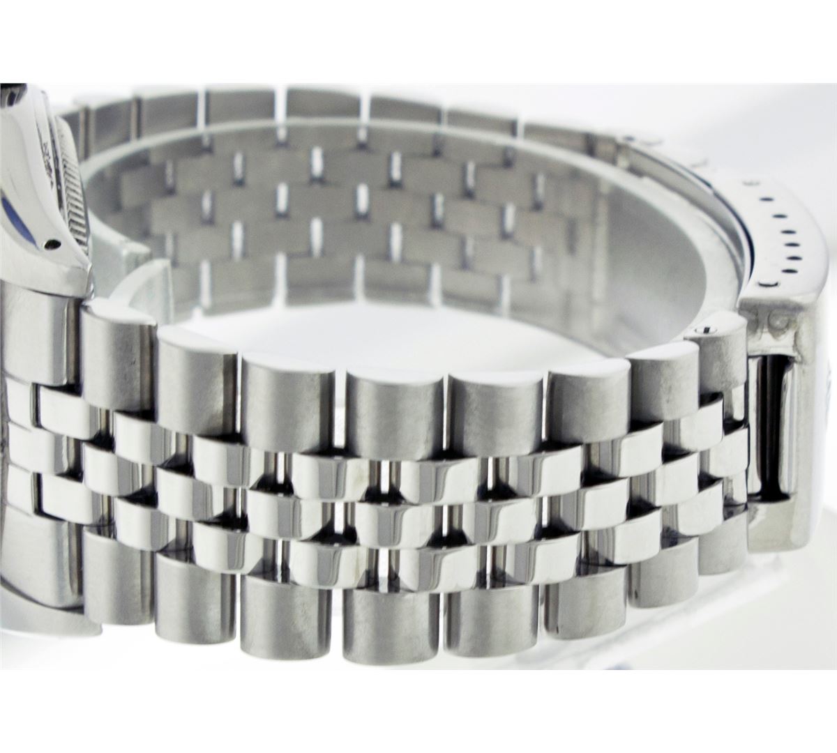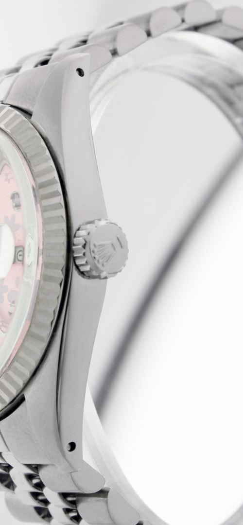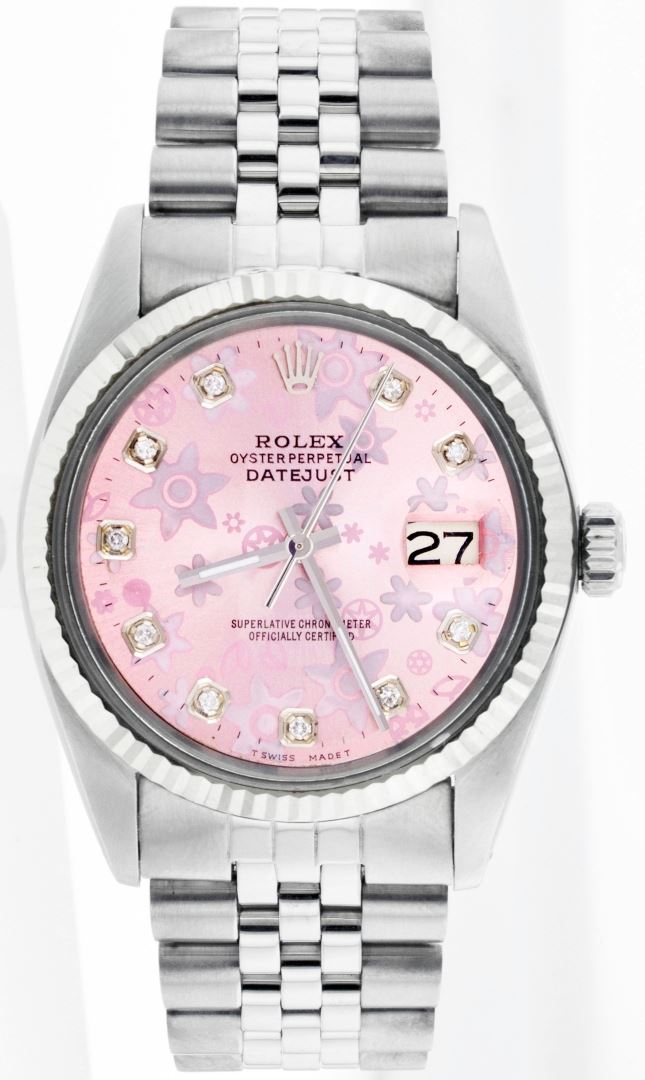 One Gents Rolex Datejust Polished, Serviced & Electronically Tested, Stainless Steel Case:36mm, Stainless Steel Crown, Bezel: 18K White Gold Fluted Bezel. Custom Crystal: Synthetic Sapphire Cyclops Lens. Movement: Automatic Winding Movement Caliber 3035. Custom Dial: Pink Floral Dial With Diamond Hour Markers, Diamond Count: 10 Diamonds, Clarity: SI-VS, Color: G To H. Date Window: 3 O'Clock Position Date Display, Quickset, Model: 16014 Condition: G-6 Extra Fine. Bracelet: Stainless Steel Jubilee. Bright Polish & Satin Finish. 6.5 Inch Length, Adjustable. Standard Clasp, With Rolex Logo.