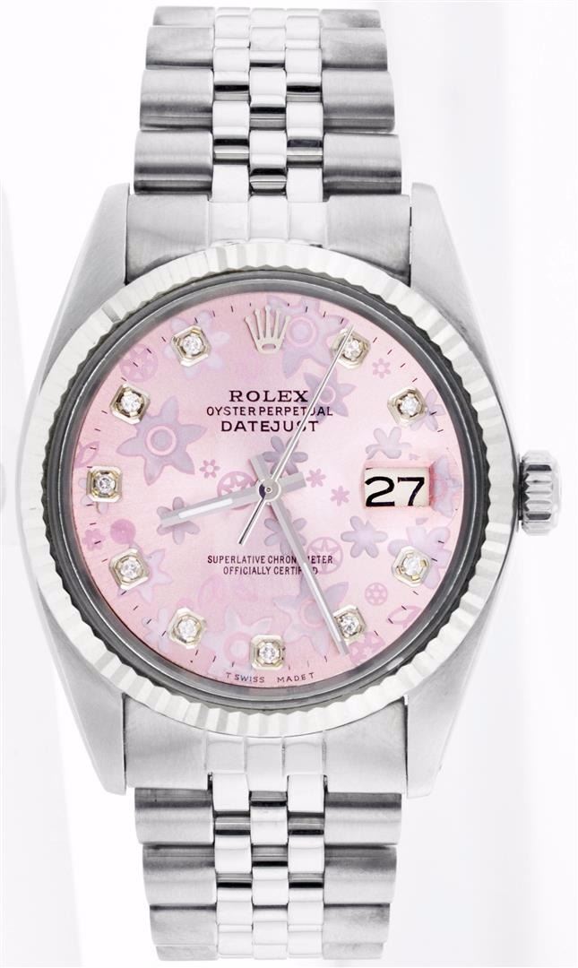 One Gents Rolex Datejust Polished, Serviced & Electronically Tested, Stainless Steel Case:36mm, Stainless Steel Crown, Bezel: 18K White Gold Fluted Bezel. Custom Crystal: Acrylic Cyclops Lens. Movement: Automatic Winding Movement Caliber 3035. Custom Dial: Pink Floral Dial With Diamond Hour Markers, Diamond Count: 10 Diamonds, Clarity: SI-VS, Color: G To H. Date Window: 3 O'Clock Position Date Display, Quickset, Model: 16014 Condition: G-6 Extra Fine. Bracelet: Stainless Steel Jubilee. Bright Polish & Satin Finish. 6.5 Inch Length, Adjustable. Standard Clasp, With Rolex Logo.