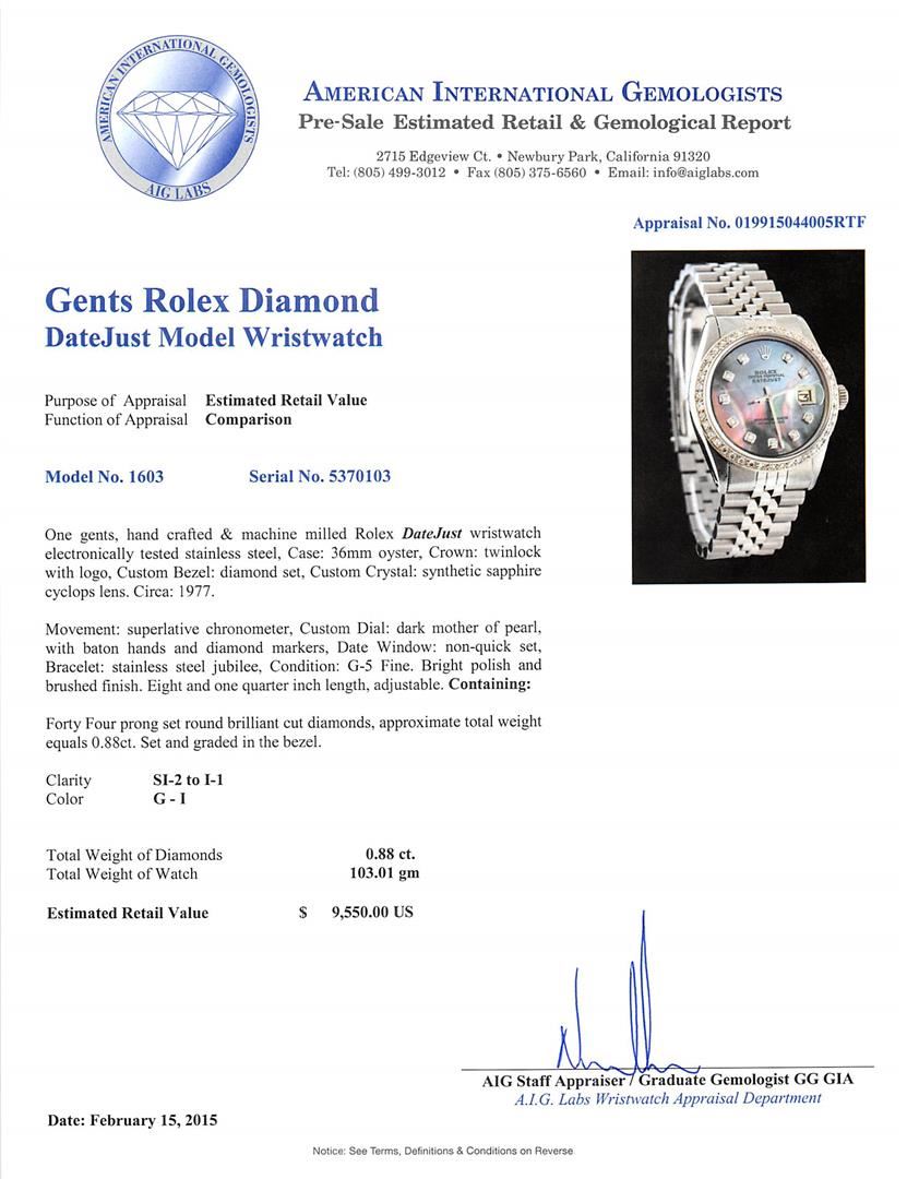 One gents, hand crafted & machine milled Rolex DateJust wristwatch electronically tested stainless steel, Case: 36mm oyster, Crown: twinlock with logo, Custom Bezel: diamond set, Custom Crystal: synthetic sapphire cyclops lens. Circa: 1977.Movement: superlative chronometer, Custom Dial: dark mother of pearl, with baton hands and diamond markers, Date Window: non-quick set, Bracelet: stainless steel jubilee, Condition: G-5 Fine. Bright polish and brushed finish. Eight and one quarter inch length, adjustable. Containing: Forty Four prong set round brilliant cut diamonds, approximate total weight equals 0.88ct. Set and graded in the bezel. Clarity SI-2 to I-1. Color: G - I. Total Weight of Diamonds 0.88ct. Total Weight of Watch 103.01 grams. AIG Appraised at $9,550.00.