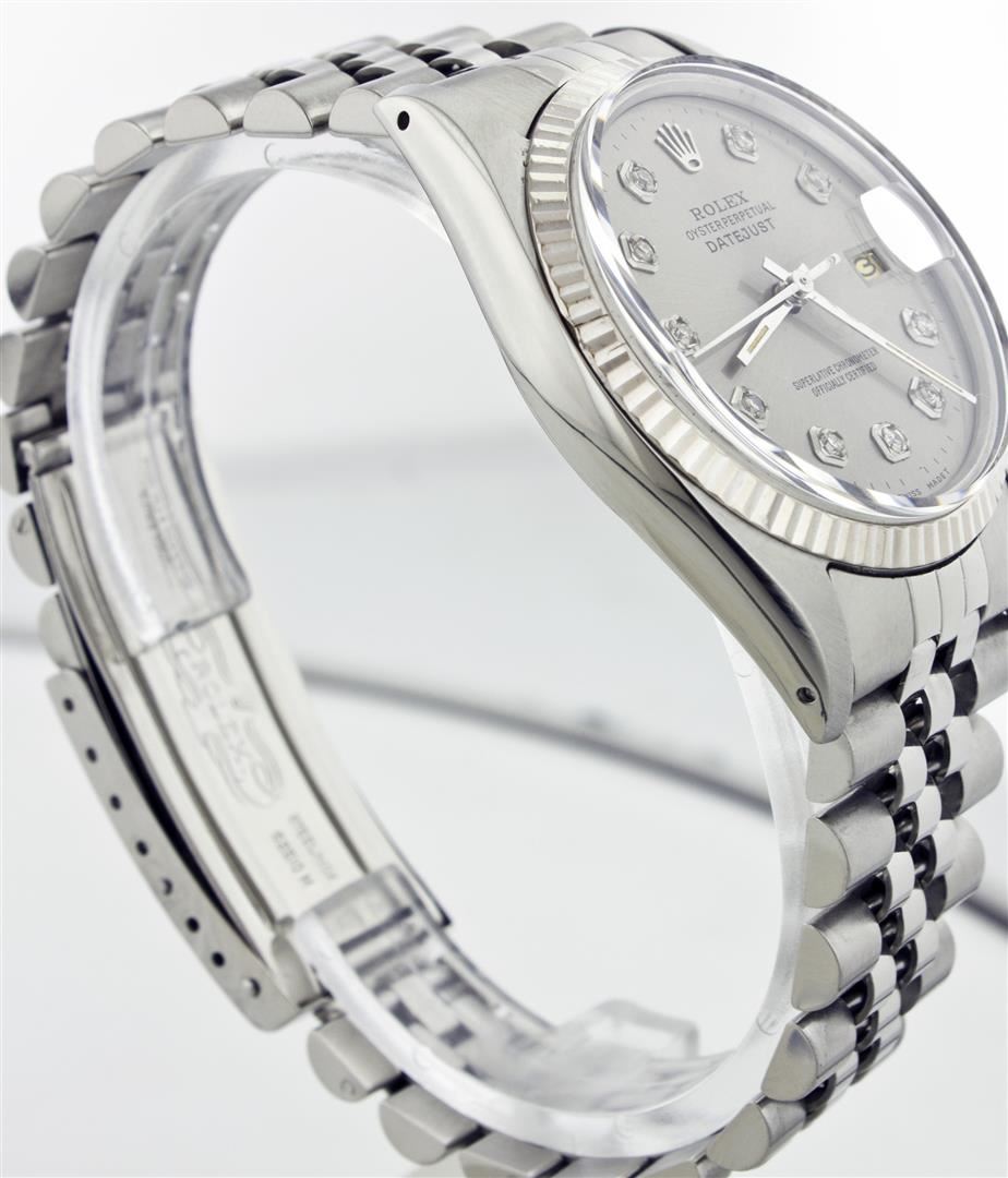 One Gents Rolex Datejust Polished, Serviced & Electronically Tested, Stainless Steel Case:36mm, Stainless Steel Crown, Bezel: 18K White Gold Fluted Bezel. Custom Crystal: Acrylic Cyclops Lens. Movement: Automatic Winding Movement Caliber 3035. Custom Dial: Grey Dial With Diamond Hour Markers, Diamond Count: 10 Diamonds, Clarity: SI-VS, Color: G To H. Date Window: 3 O'Clock Position Date Display, Quickset, Model: 16014 Condition: G-6 Extra Fine. Bracelet: Stainless Steel Jubilee. Bright Polish & Satin Finish. 6.5 Inch Length, Adjustable. Standard Clasp, With Rolex Logo.