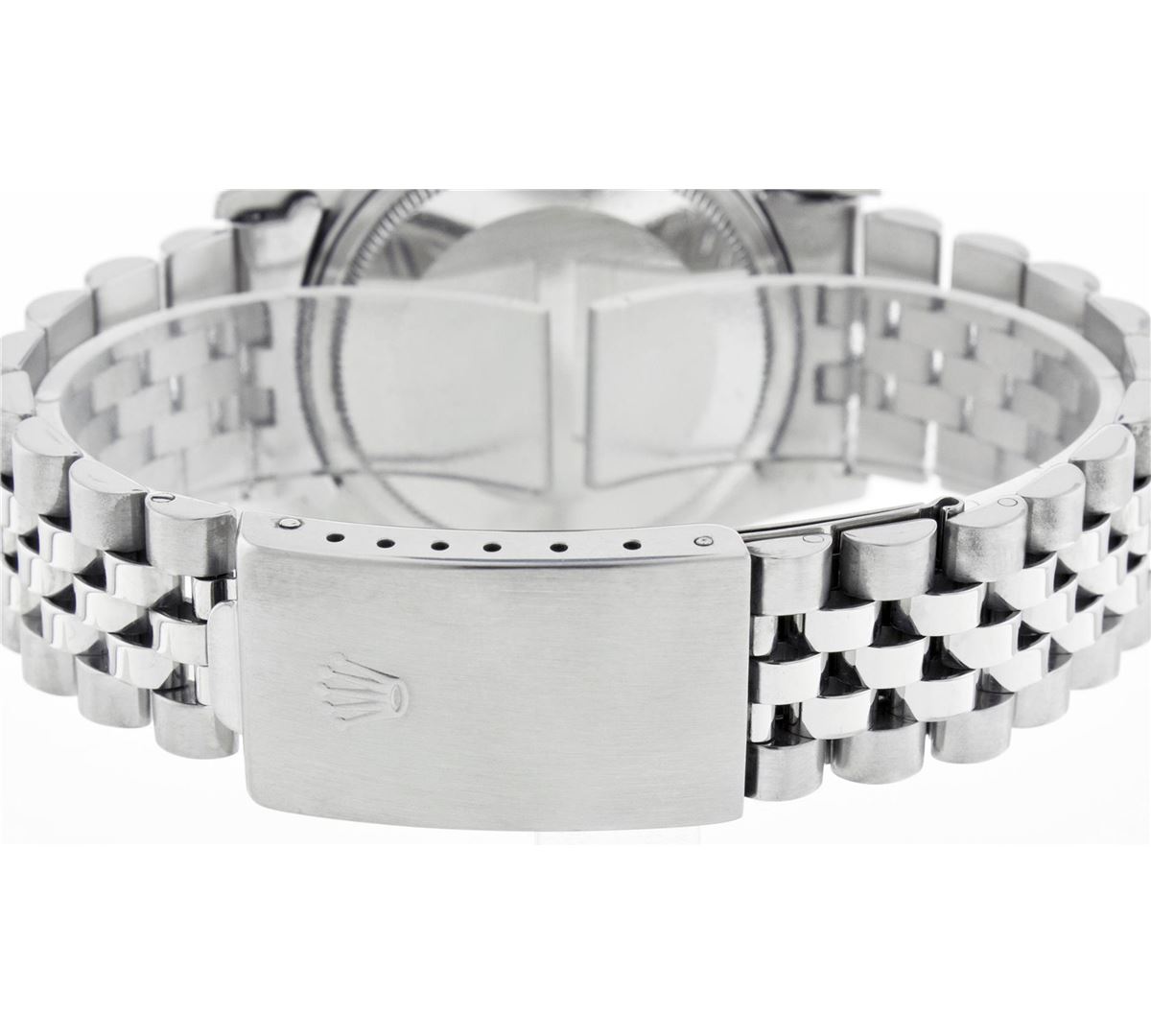 One Gents Rolex Datejust Polished, Serviced & Electronically Tested, Stainless Steel Case:36mm, Stainless Steel Crown, Bezel: 18K White Gold Fluted Bezel. Custom Crystal: Acrylic Cyclops Lens. Movement: Automatic Winding Movement Caliber 3035. Custom Dial: Pink Floral Dial With Diamond Hour Markers, Diamond Count: 10 Diamonds, Clarity: SI-VS, Color: G To H. Date Window: 3 O'Clock Position Date Display, Quickset, Model: 16014 Condition: G-6 Extra Fine. Bracelet: Stainless Steel Jubilee. Bright Polish & Satin Finish. 6.5 Inch Length, Adjustable. Standard Clasp, With Rolex Logo.