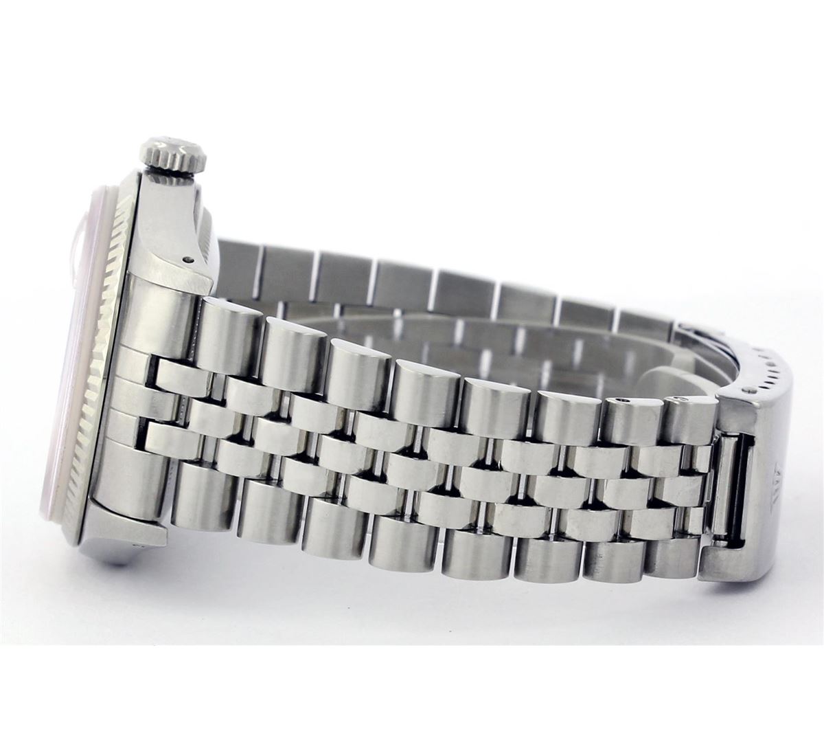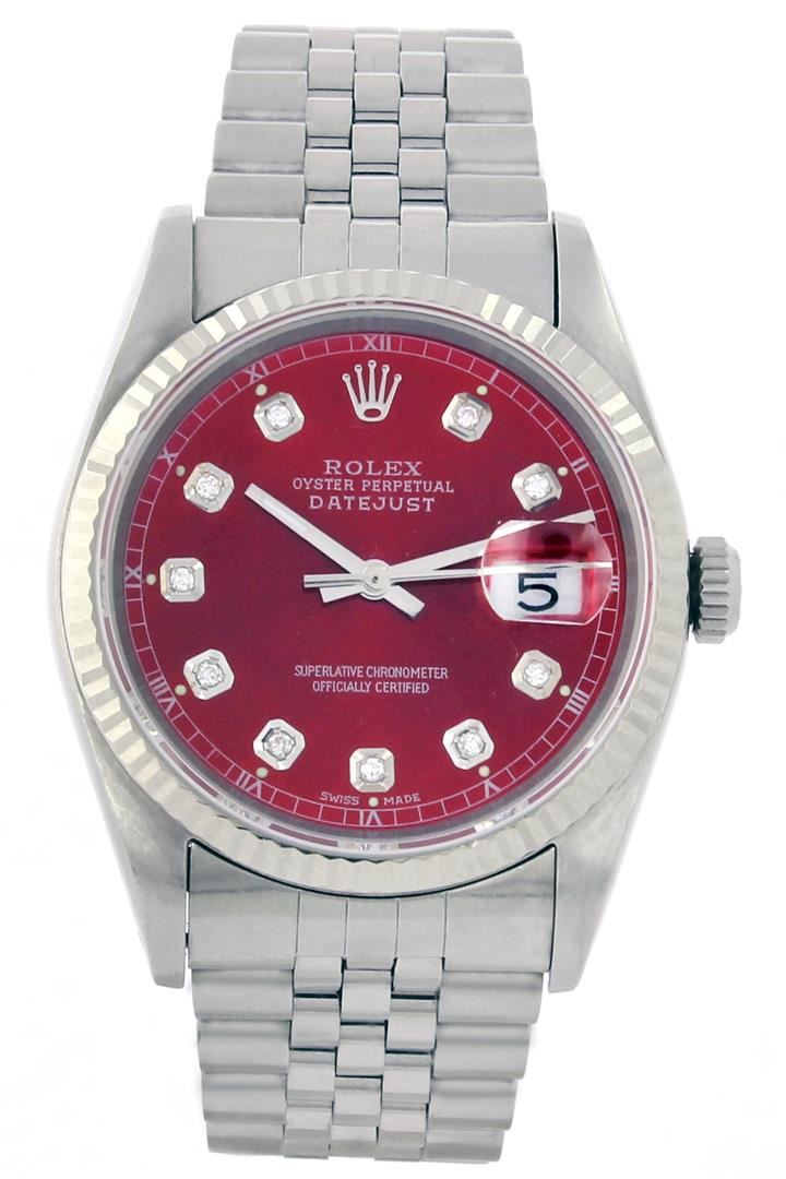 One Gents Rolex Datejust Polished, Serviced & Electronically Tested, Stainless Steel Case:36mm, Stainless Steel Crown, Custom Bezel: 18K White Gold Fluted Bezel. Custom Crystal: Acrylic Cyclops Lens. Movement: Automatic Winding Movement Caliber 3035. Custom Dial: Red Diamond Dial, Diamond Count: 10 Diamonds, Clarity: SI-VS, Color: G to H. Date Window: 3 O'Clock Position Date Display, Quickset, Model: 16014 Condition: G-6 Extra Fine. Bracelet: Stainless Steel Jubilee. Bright Polish & Satin Finish. 6.5 Inch Length, Adjustable. Standard Clasp, With Rolex Logo.