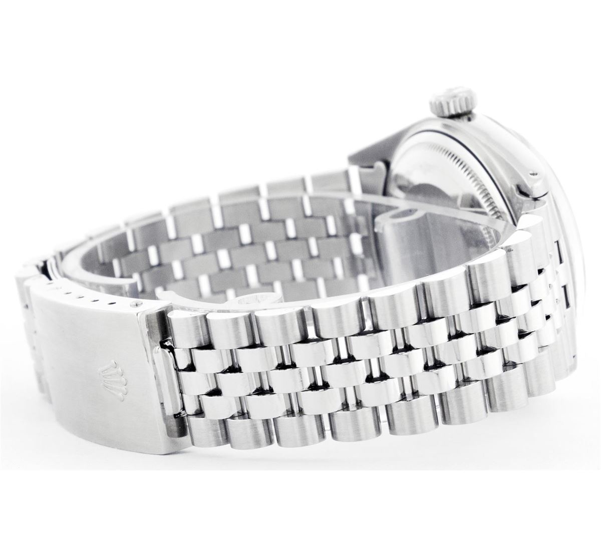 One Gents Rolex Datejust Polished, Serviced & Electronically Tested, Stainless Steel Case:36mm, Stainless Steel Crown, Custom Bezel: 18K White Gold Fluted Bezel. Custom Crystal: Acrylic Cyclops Lens. Movement: Automatic Winding Movement Caliber 3035. Custom Dial: Blue With Diamond Hour Markers, Diamond Count: 8 Diamonds + 2 Baguettes, Clarity: SI-VS, Color: G to H. Date Window: 3 O'Clock Position Date Display, Quickset, Model: 16014 Condition: G-6 Extra Fine. Bracelet: Stainless Steel Jubilee. Bright Polish & Satin Finish. 6.5 Inch Length, Adjustable. Standard Clasp, With Rolex Logo.