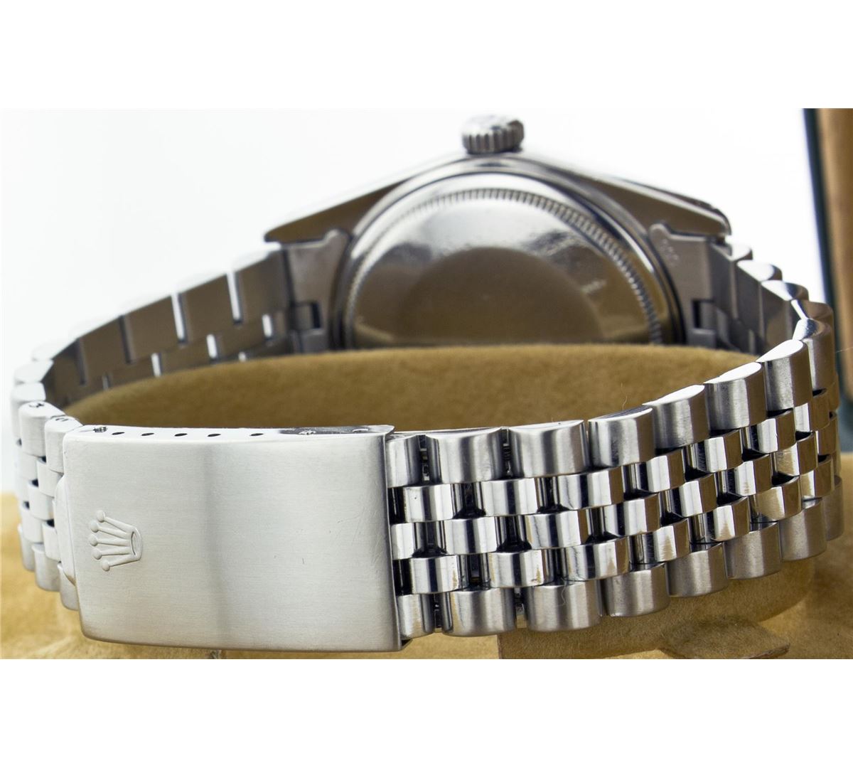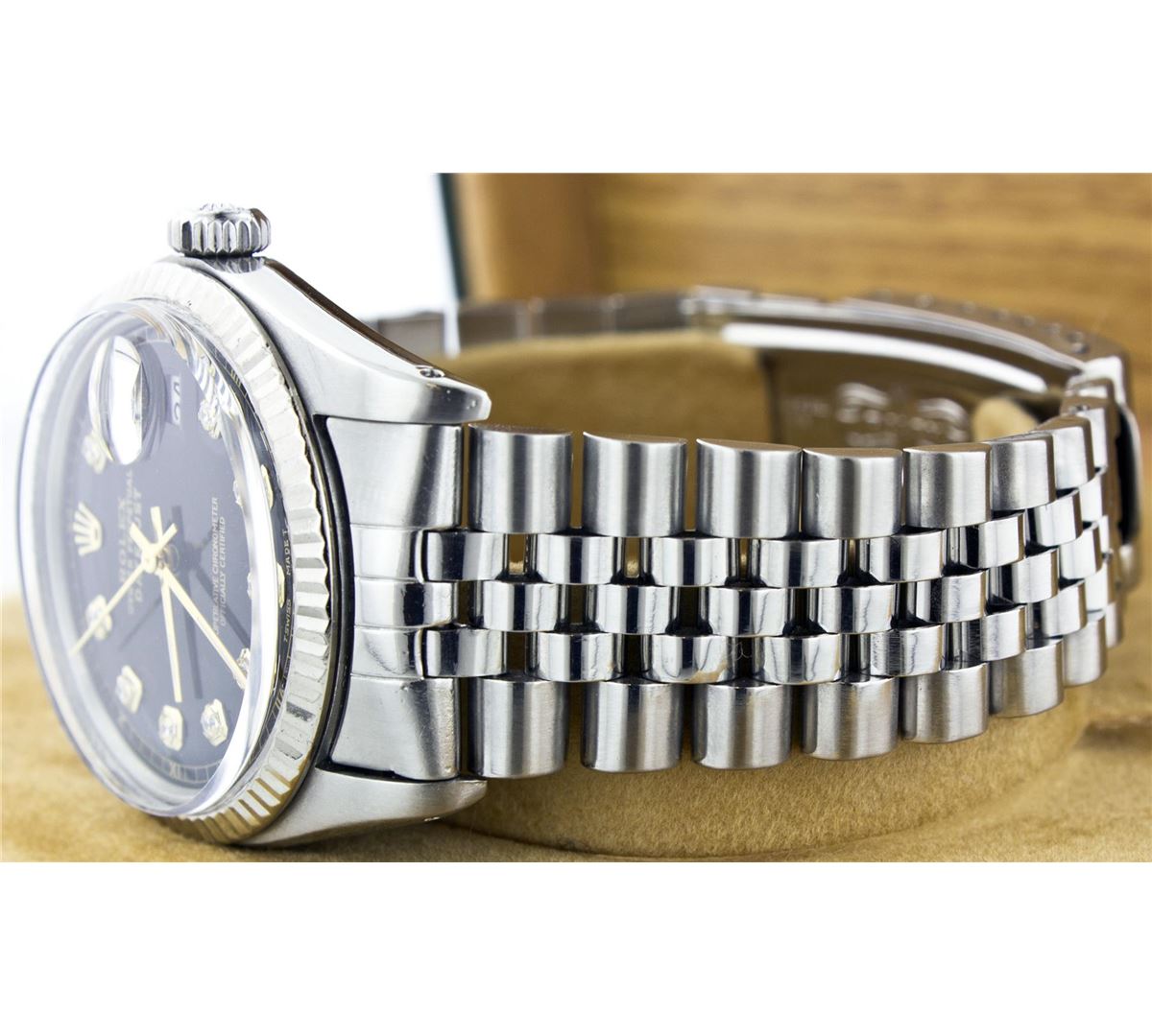 One Gents Rolex Datejust Polished, Serviced & Electronically Tested, Stainless Steel Case:36mm, Stainless Steel Crown, Original Bezel: 18K White Gold Fluted Bezel. Custom Crystal: Acrylic Cyclops Lens. Movement: Automatic Winding Movement Caliber 3035. Custom Dial: Black Diamond Dial With Track, Diamond Count: 10 Diamonds, Clarity: SI-VS, Color: G to H. Date Window: 3 O'Clock Position Date Display, Quickset, Model: 16014 Condition: G-6 Extra Fine. Bracelet: Stainless Steel Jubilee. Bright Polish & Satin Finish. 6.5 Inch Length, Adjustable. Standard Clasp, With Rolex Logo.