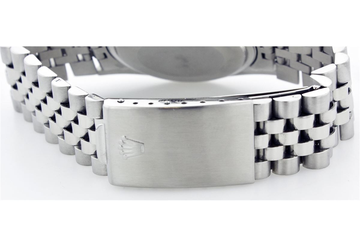 One Mens Rolex Datejust Polished, Serviced & Electronically Tested, Stainless Steel Case:36mm, Stainless Steel Crown, Custom Bezel: 18K White Gold Fluted Bezel. Custom Crystal: Synthetic Sapphire Cyclops Lens. Movement: Automatic Winding Movement Caliber 3035. Custom Dial: Gray Diamond Dial, Diamond Count: 10 Diamonds, Clarity: SI-VS, Color: G to H. Date Window: 3 O'Clock Position Date Display, Quickset, Model: 16014 Condition: G-6 Extra Fine. Bracelet: Stainless Steel Jubilee. Bright Polish & Satin Finish. 6.5 Inch Length, Adjustable. Standard Clasp, With Rolex Logo.