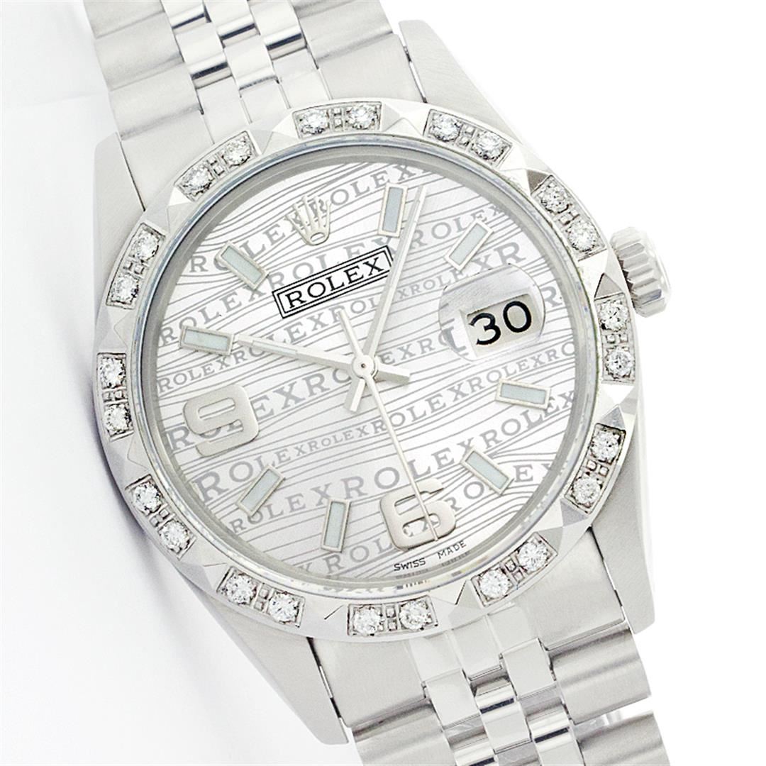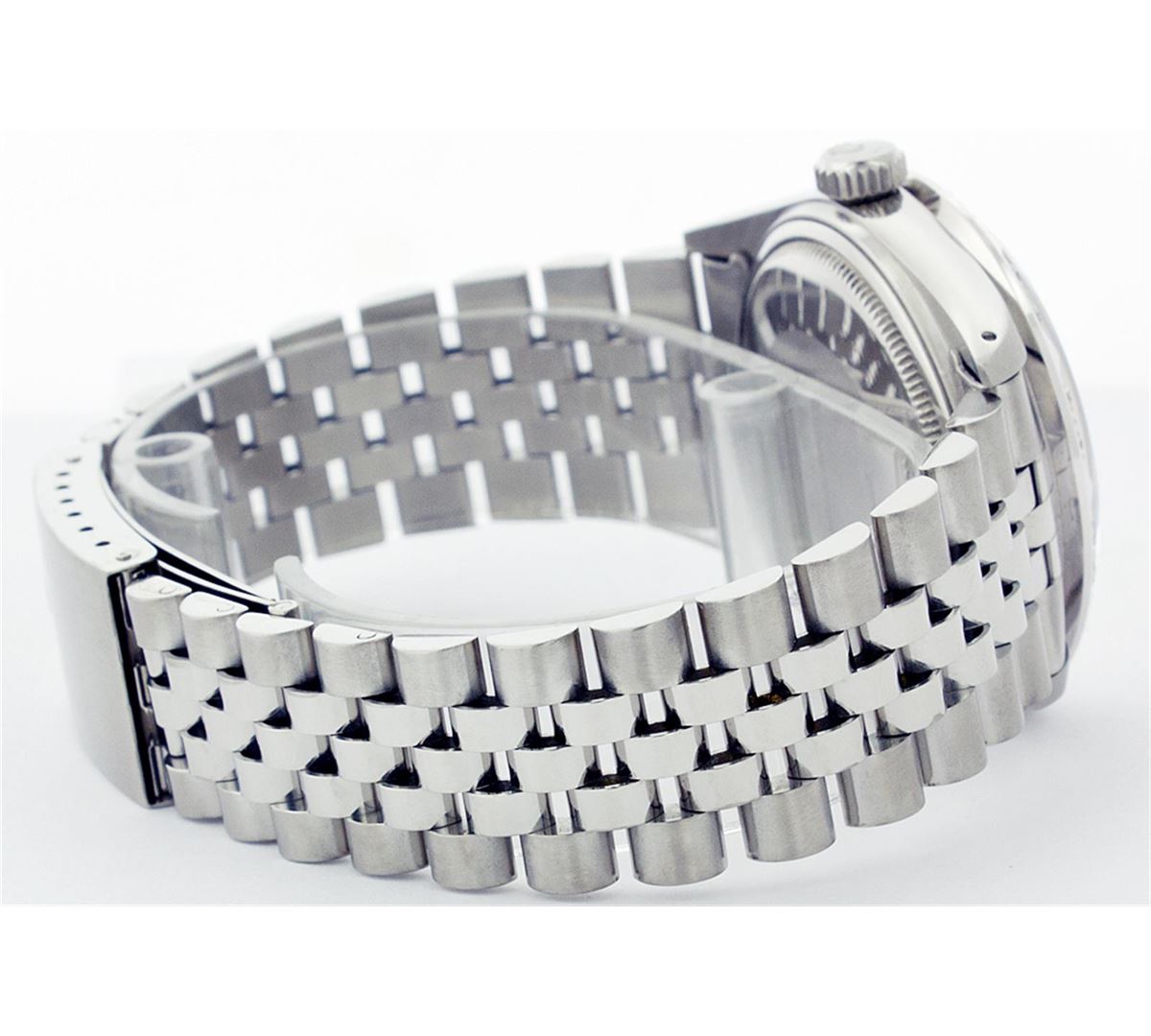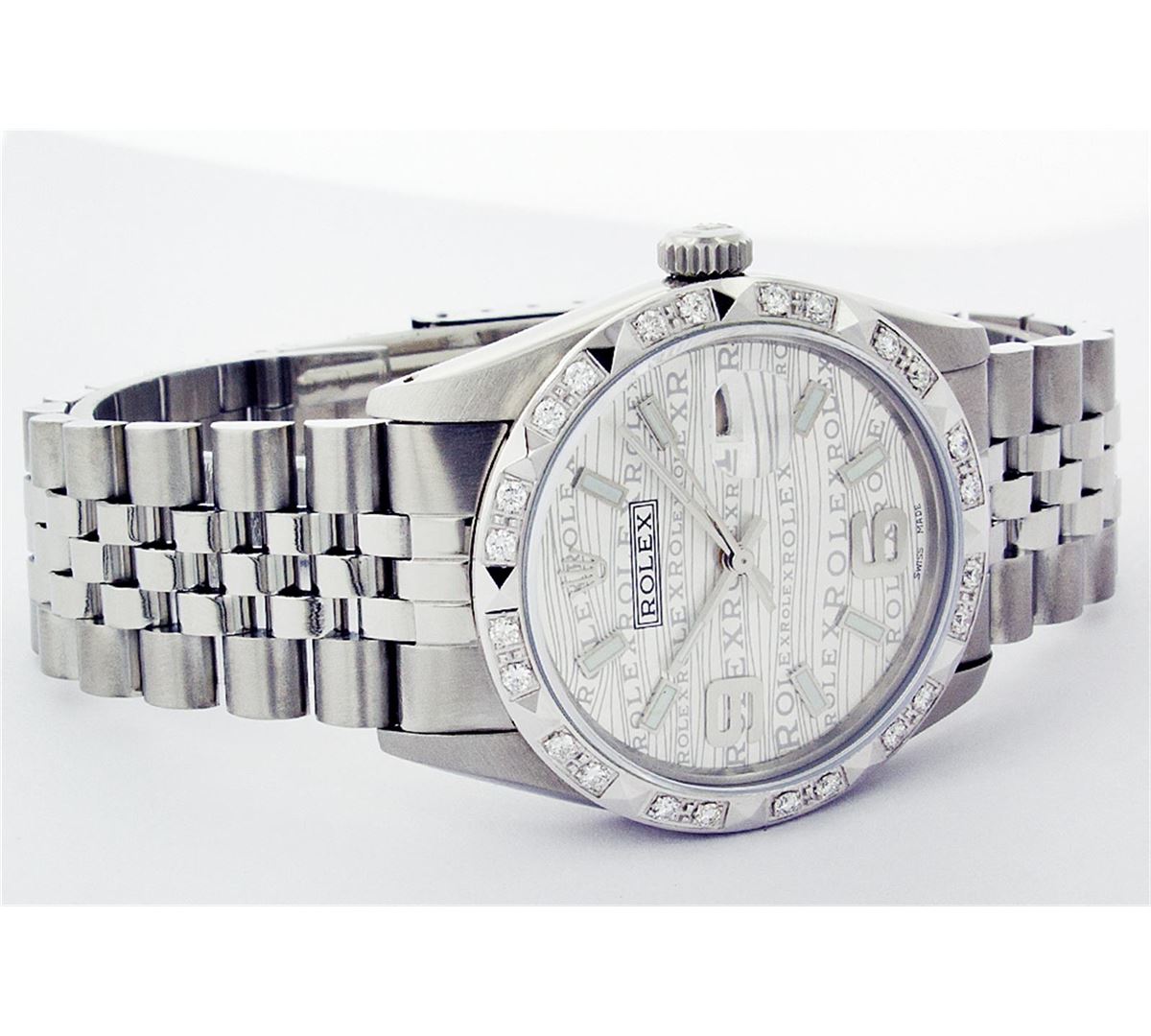 One Mens Rolex Datejust Polished, Serviced & Electronically Tested, Stainless Steel Case:36mm, Stainless Steel Crown, Custom Bezel: 18K White Pyramid Diamond Bezel, Diamond Count: 24 Diamonds Total Weight .70 Carat, Clarity: SI-VS, Color: G to H. Custom Crystal: Synthetic Sapphire Cyclops Lens. Movement: Automatic Winding Movement Caliber 3035. Custom Dial: Silver Wave With Arabic Hour Markers. Date Window: 3 O'Clock Position Date Display, Quickset, Model: 16014 Condition: G-6 Extra Fine. Bracelet: Stainless Steel Jubilee. Bright Polish & Satin Finish. 6.5 Inch Length, Adjustable. Standard Clasp, With Rolex Logo.