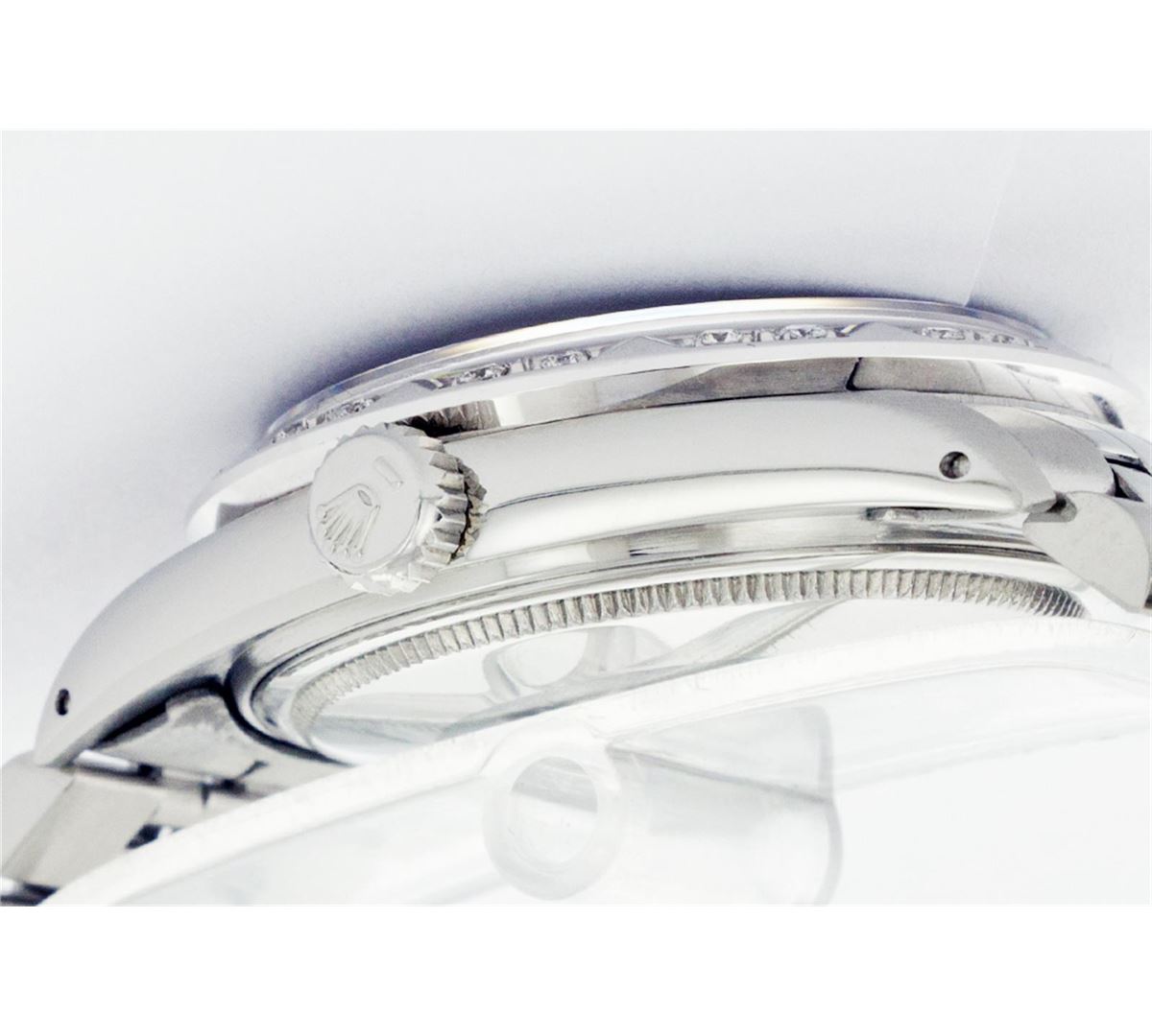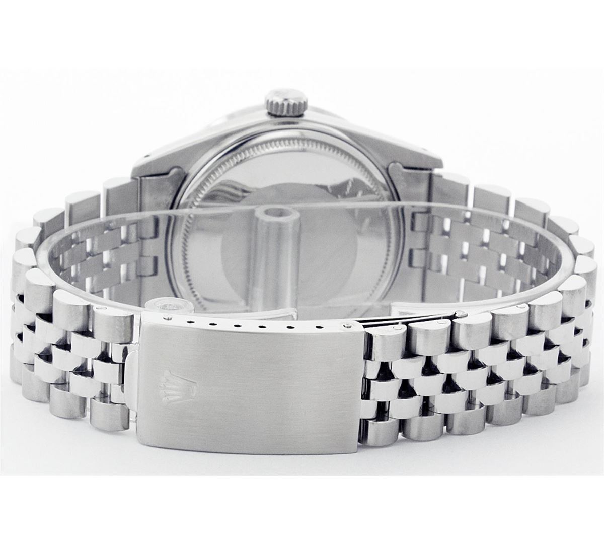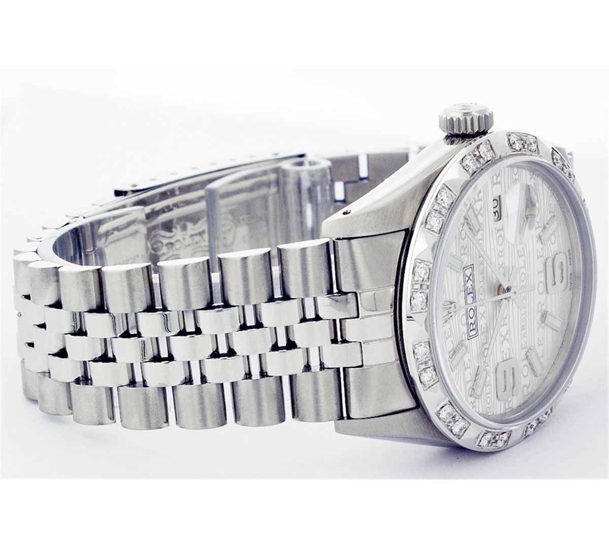 One Mens Rolex Datejust Polished, Serviced & Electronically Tested, Stainless Steel Case:36mm, Stainless Steel Crown, Custom Bezel: 18K White Pyramid Diamond Bezel, Diamond Count: 24 Diamonds Total Weight .70 Carat, Clarity: SI-VS, Color: G to H. Custom Crystal: Synthetic Sapphire Cyclops Lens. Movement: Automatic Winding Movement Caliber 3035. Custom Dial: Silver Wave With Arabic Hour Markers. Date Window: 3 O'Clock Position Date Display, Quickset, Model: 16014 Condition: G-6 Extra Fine. Bracelet: Stainless Steel Jubilee. Bright Polish & Satin Finish. 6.5 Inch Length, Adjustable. Standard Clasp, With Rolex Logo.
