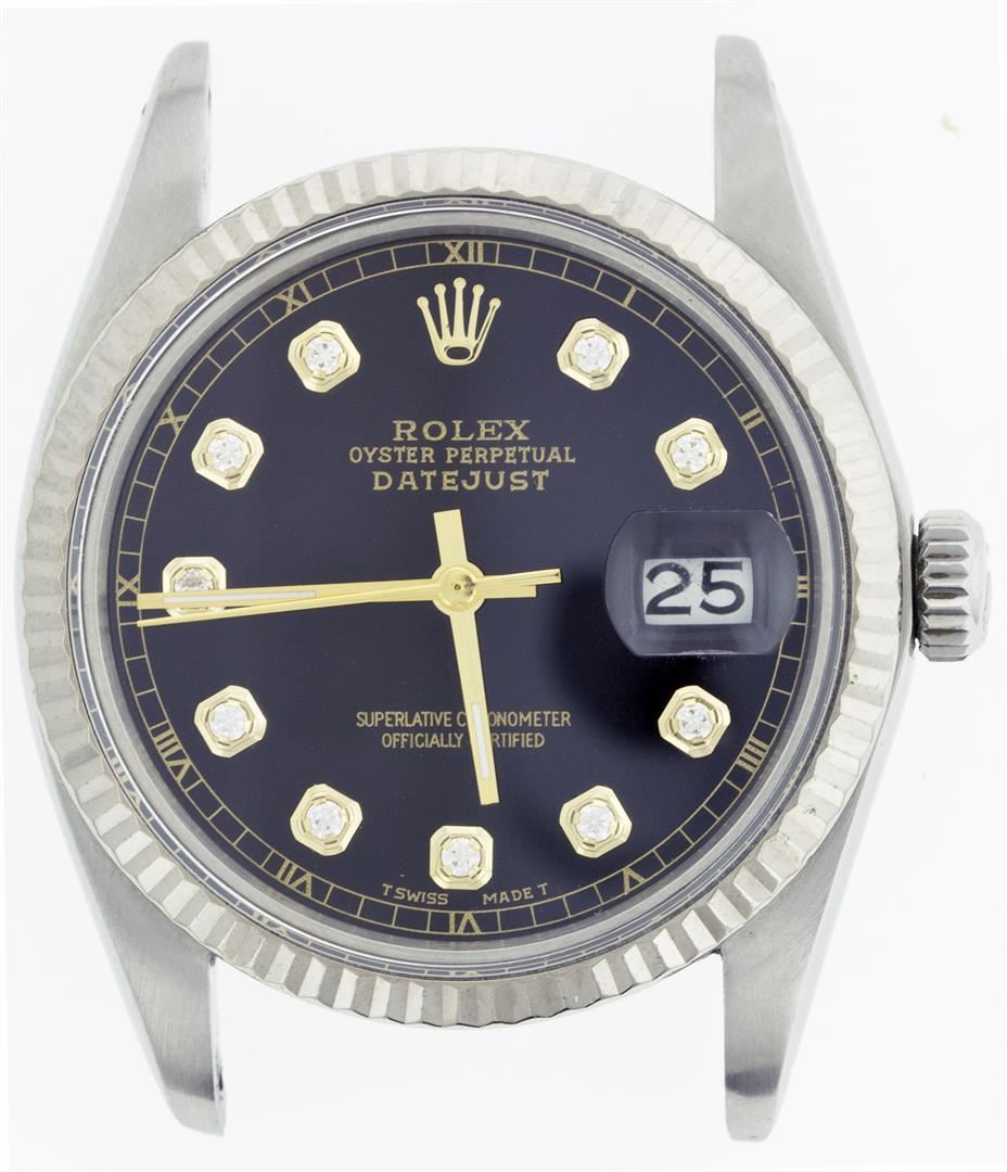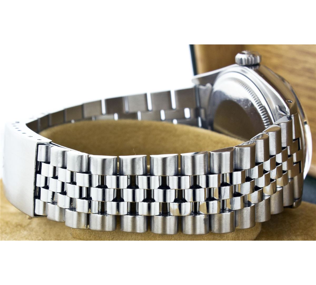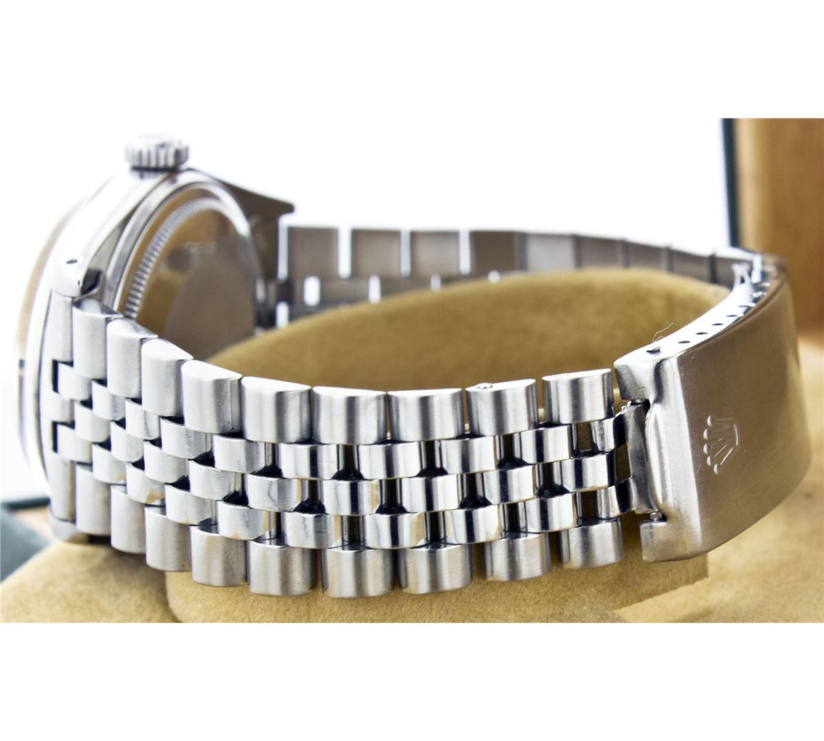 One Gents Rolex Datejust Polished, Serviced & Electronically Tested, Stainless Steel Case:36mm, Stainless Steel Crown, Original Bezel: 18K White Gold Fluted Bezel. Custom Crystal: Acrylic Cyclops Lens. Movement: Automatic Winding Movement Caliber 3035. Custom Dial: Black Diamond Dial With Track, Diamond Count: 10 Diamonds, Clarity: SI-VS, Color: G to H. Date Window: 3 O'Clock Position Date Display, Quickset, Model: 16014 Condition: G-6 Extra Fine. Bracelet: Stainless Steel Jubilee. Bright Polish & Satin Finish. 6.5 Inch Length, Adjustable. Standard Clasp, With Rolex Logo.