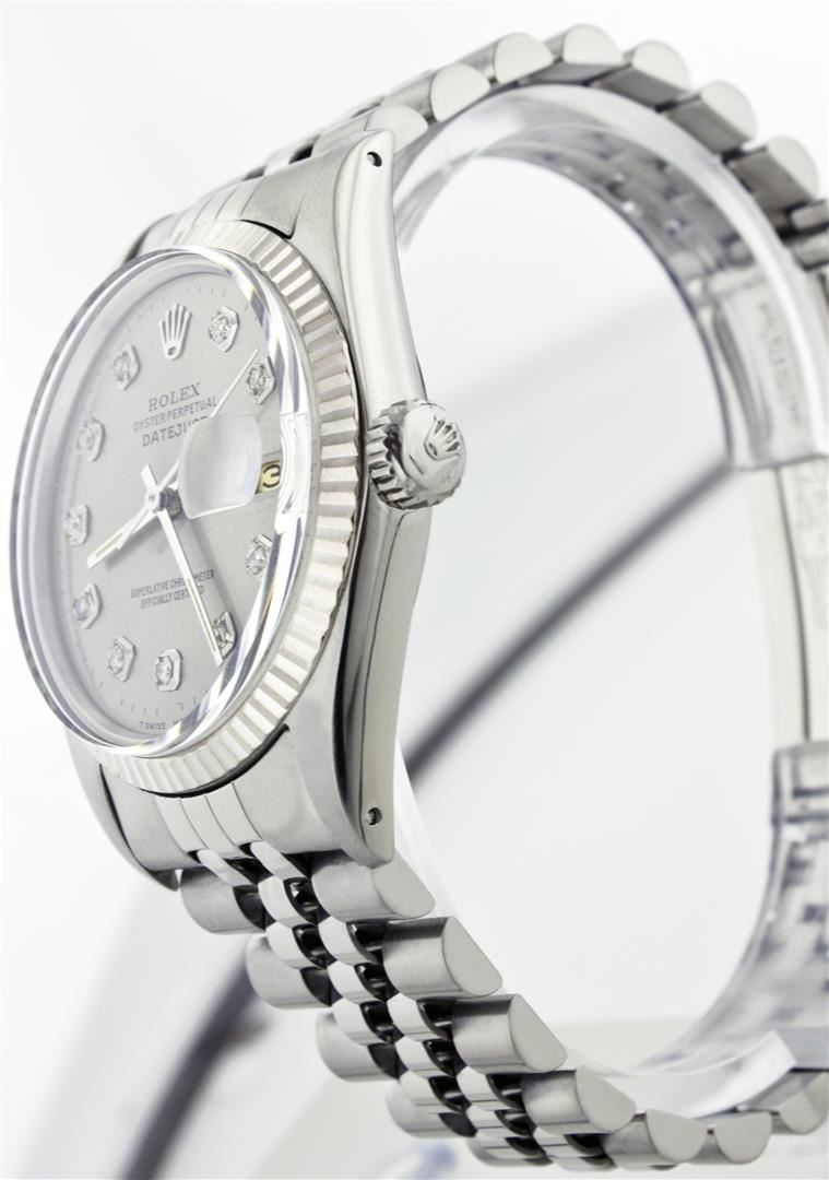 One Gents Rolex Datejust Polished, Serviced & Electronically Tested, Stainless Steel Case:36mm, Stainless Steel Crown, Bezel: 18K White Gold Fluted Bezel. Custom Crystal: Acrylic Cyclops Lens. Movement: Automatic Winding Movement Caliber 3035. Custom Dial: Grey Dial With Diamond Hour Markers, Diamond Count: 10 Diamonds, Clarity: SI-VS, Color: G To H. Date Window: 3 O'Clock Position Date Display, Quickset, Model: 16014 Condition: G-6 Extra Fine. Bracelet: Stainless Steel Jubilee. Bright Polish & Satin Finish. 6.5 Inch Length, Adjustable. Standard Clasp, With Rolex Logo.