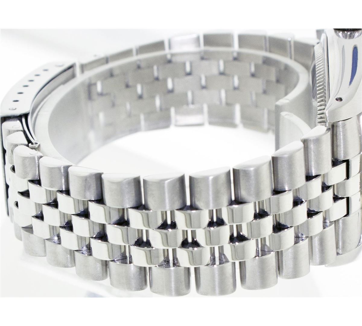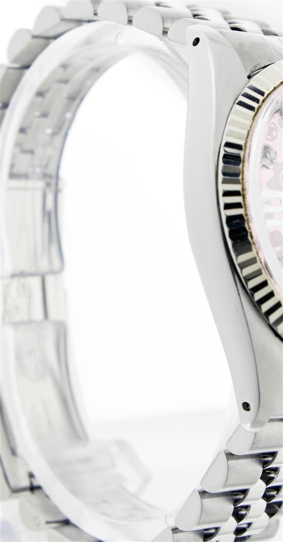 One Gents Rolex Datejust Polished, Serviced & Electronically Tested, Stainless Steel Case:36mm, Stainless Steel Crown, Bezel: 18K White Gold Fluted Bezel. Custom Crystal: Acrylic Cyclops Lens. Movement: Automatic Winding Movement Caliber 3035. Custom Dial: Pink Floral Dial With Diamond Hour Markers, Diamond Count: 10 Diamonds, Clarity: SI-VS, Color: G To H. Date Window: 3 O'Clock Position Date Display, Quickset, Model: 16014 Condition: G-6 Extra Fine. Bracelet: Stainless Steel Jubilee. Bright Polish & Satin Finish. 6.5 Inch Length, Adjustable. Standard Clasp, With Rolex Logo.