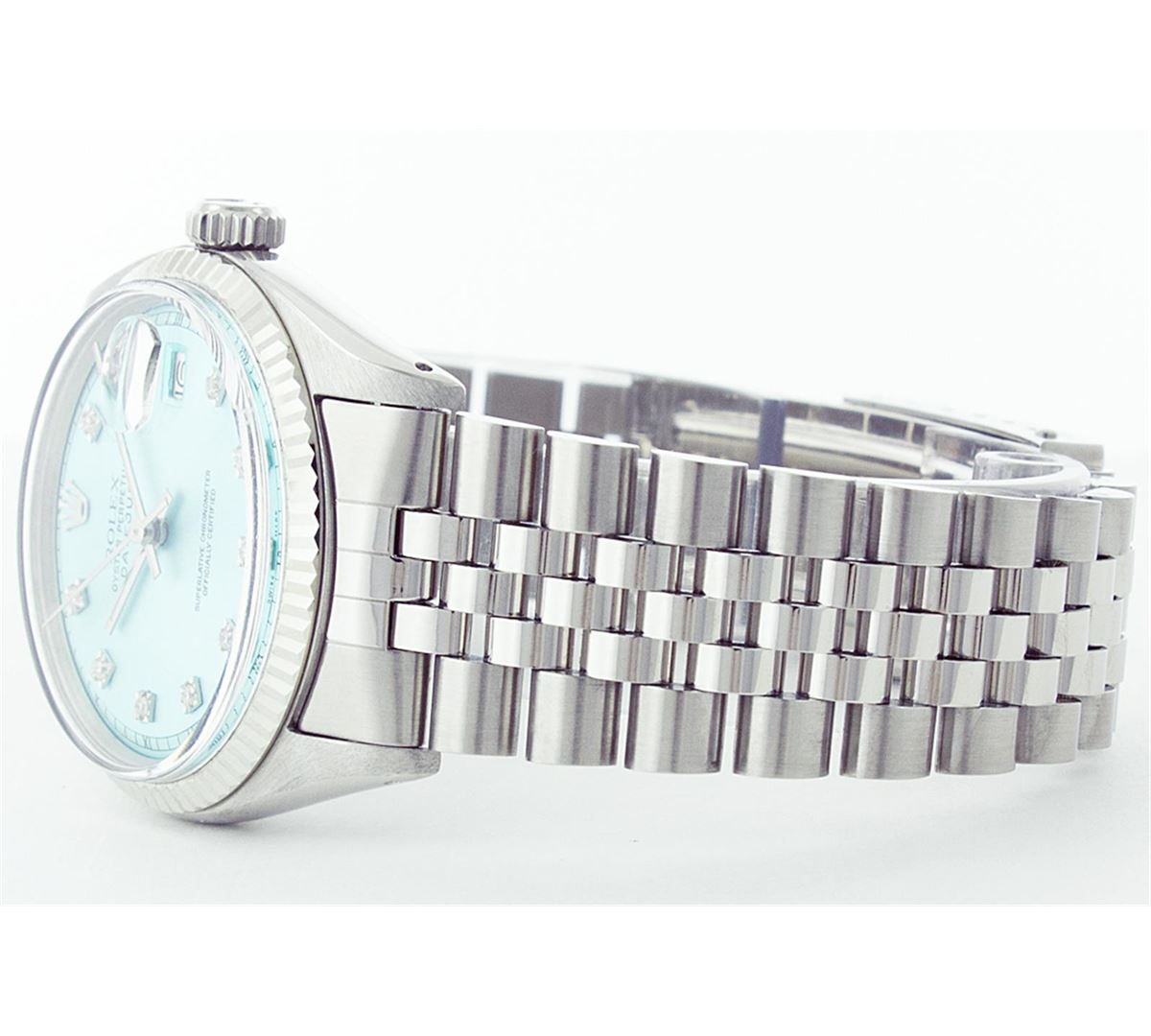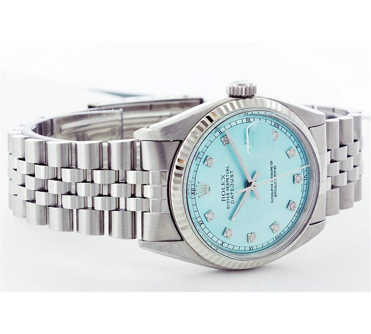 One Mens Rolex Datejust Polished Bright with Satin Finish, Serviced & Electronically Tested, Stainless Steel Case:36mm, Stainless Steel Crown, Original Bezel: 14K White Gold Fluted Bezel. Custom Crystal: Acrylic Cyclops Lens. Movement: Automatic Winding Movement Caliber 3035. Custom Dial: Ice Blue Dial With Diamond Hour Markers and Track, 10 Diamond in Dial G To H In Color, Si-VS Clarity. Date Window: 3 O'Clock Position Date Display, Quickset, Model: 16014 Condition: G-6 Extra Fine. Bracelet: Stainless Steel Jubilee. Bright Polish & Satin Finish. 6.5 Inch Length, Adjustable. Standard Clasp, With Rolex Logo.