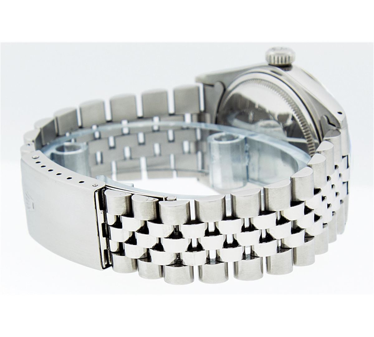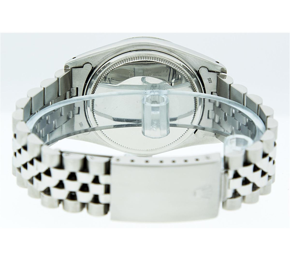 One Gents Rolex Datejust Polished, Serviced & Electronically Tested, Stainless Steel Case:36mm, Stainless Steel Crown, Custom Bezel: 18K White Gold Fluted Bezel. Custom Crystal: Acrylic Cyclops Lens. Movement: Automatic Winding Movement Caliber 3035. Custom Dial: Mother Of Pearl With Diamond Hour Markers, Diamond Count: 10 Diamonds In Dial, Clarity: SI-VS, Color: G to H. Date Window: 3 O'Clock Position Date Display, Quickset, Model: 16014 Condition: G-6 Extra Fine. Bracelet: Stainless Steel Jubilee. Bright Polish & Satin Finish. 6.5 Inch Length, Adjustable. Standard Clasp, With Rolex Logo.