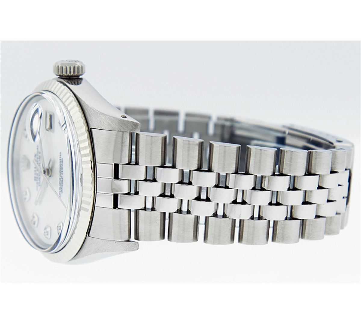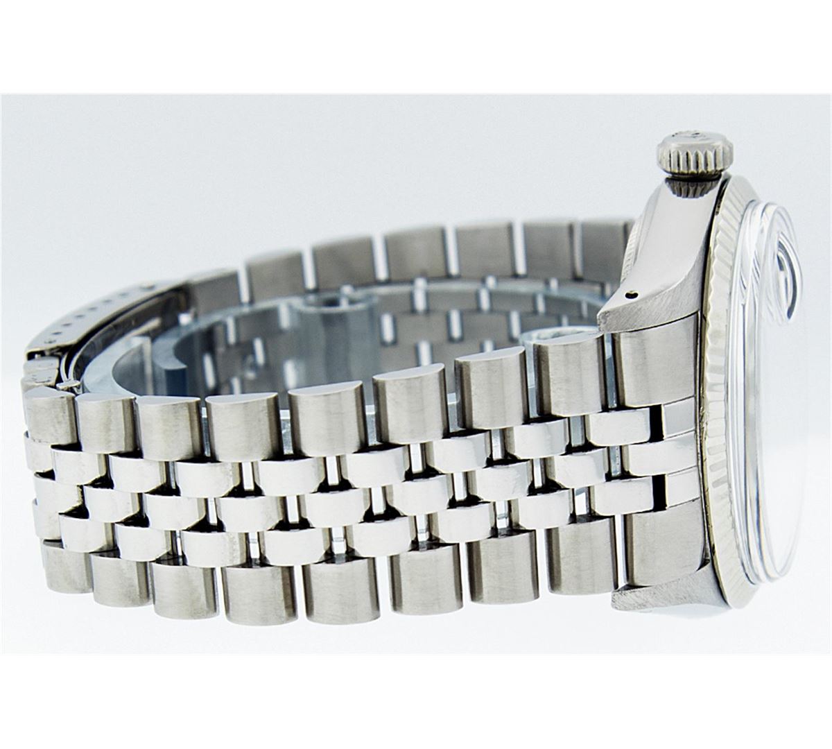 One Gents Rolex Datejust Polished, Serviced & Electronically Tested, Stainless Steel Case:36mm, Stainless Steel Crown, Custom Bezel: 18K White Gold Fluted Bezel. Custom Crystal: Acrylic Cyclops Lens. Movement: Automatic Winding Movement Caliber 3035. Custom Dial: Mother Of Pearl With Diamond Hour Markers, Diamond Count: 10 Diamonds In Dial, Clarity: SI-VS, Color: G to H. Date Window: 3 O'Clock Position Date Display, Quickset, Model: 16014 Condition: G-6 Extra Fine. Bracelet: Stainless Steel Jubilee. Bright Polish & Satin Finish. 6.5 Inch Length, Adjustable. Standard Clasp, With Rolex Logo.