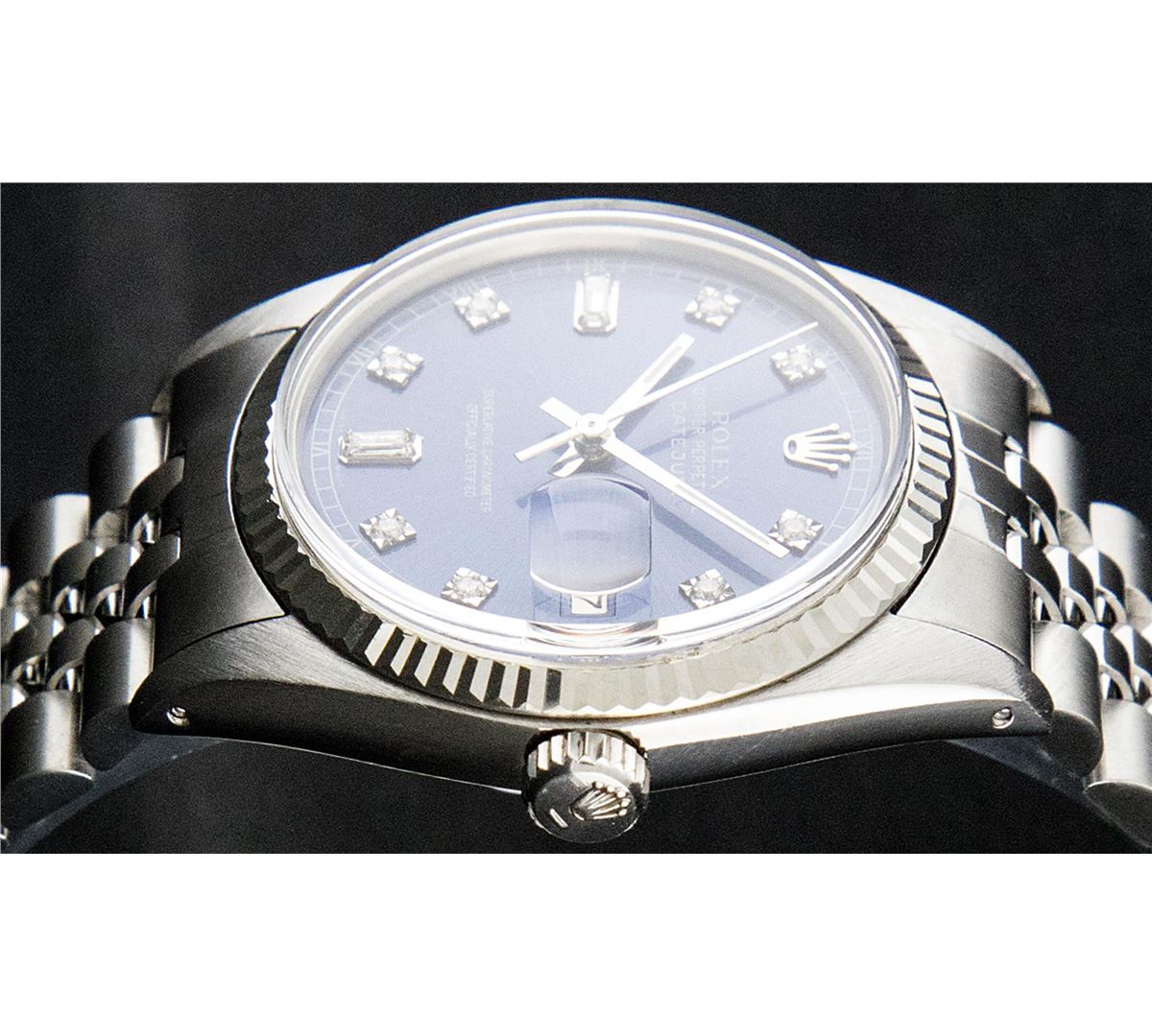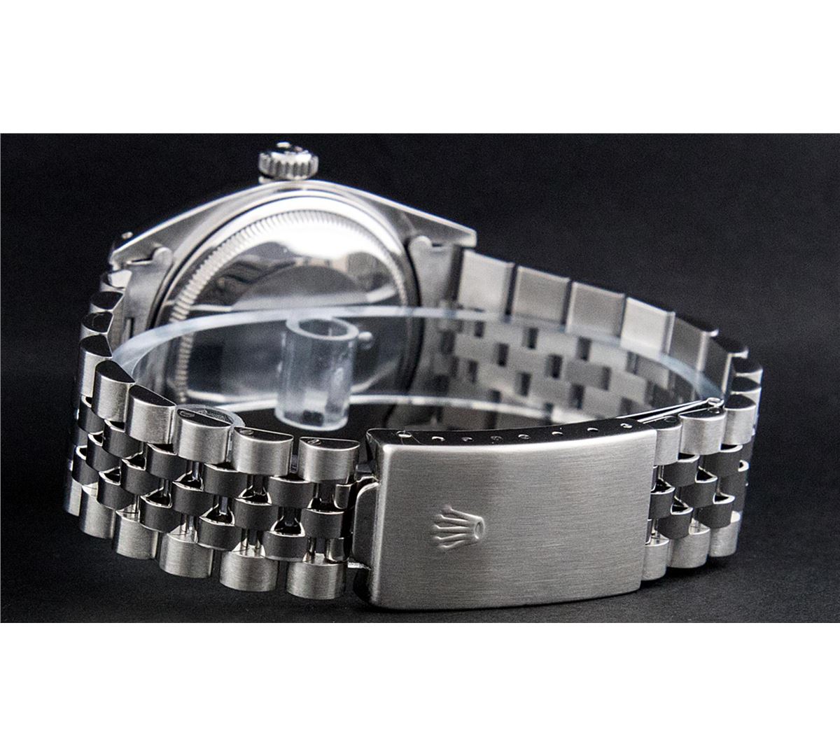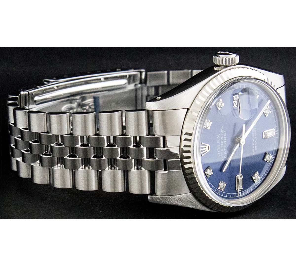 One Gents Rolex Datejust Polished, Serviced & Electronically Tested, Stainless Steel Case:36mm, Stainless Steel Crown, Bezel: 18K White Gold Fluted Bezel. Custom Crystal: Acrylic Cyclops Lens. Movement: Automatic Winding Movement Caliber 3035. Custom Dial: Blue With Diamond Hour Markers Square Setting, Diamond Count: 8 Diamonds + 2 Baguettes, Clarity: SI-VS, Color: G to H. Date Window: 3 O'Clock Position Date Display, Quickset, Model: 16014 Condition: G-6 Extra Fine. Bracelet: Stainless Steel Jubilee. Bright Polish & Satin Finish. 7.0 Inch Length, Adjustable. Standard Clasp, With Rolex Logo. Comes with 6 month warranty.
