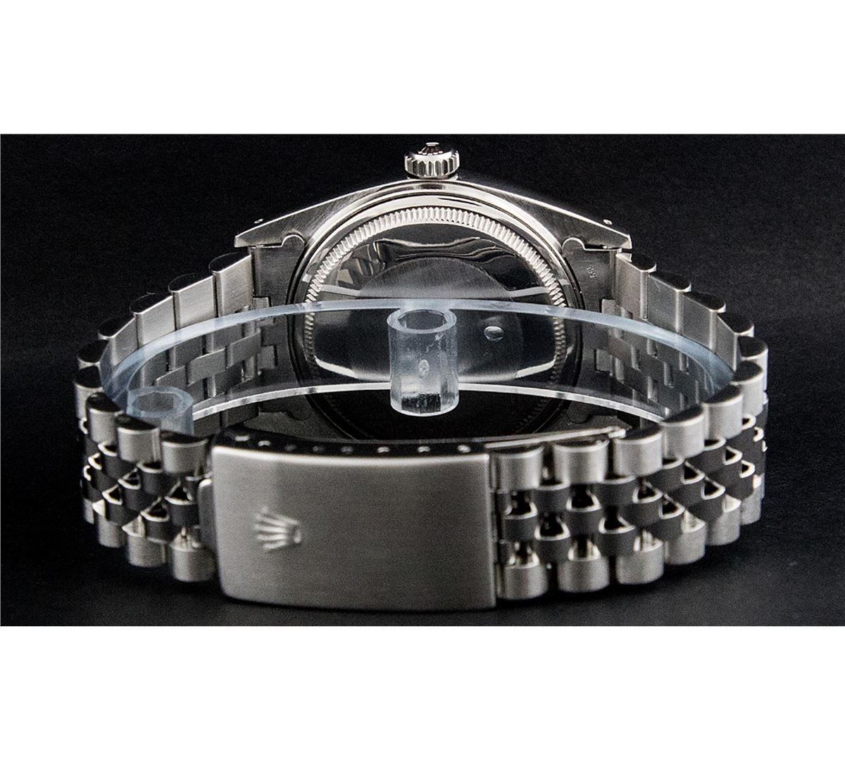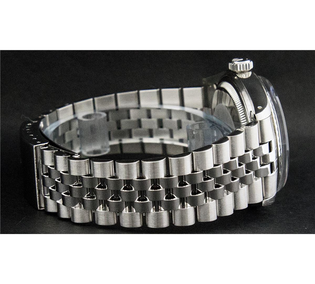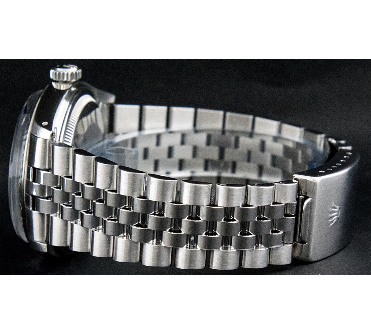 One Gents Rolex Datejust Polished, Serviced & Electronically Tested, Stainless Steel Case:36mm, Stainless Steel Crown, Bezel: 18K White Gold Fluted Bezel. Custom Crystal: Acrylic Cyclops Lens. Movement: Automatic Winding Movement Caliber 3035. Custom Dial: Blue With Diamond Hour Markers Square Setting, Diamond Count: 8 Diamonds + 2 Baguettes, Clarity: SI-VS, Color: G to H. Date Window: 3 O'Clock Position Date Display, Quickset, Model: 16014 Condition: G-6 Extra Fine. Bracelet: Stainless Steel Jubilee. Bright Polish & Satin Finish. 7.0 Inch Length, Adjustable. Standard Clasp, With Rolex Logo. Comes with 6 month warranty.