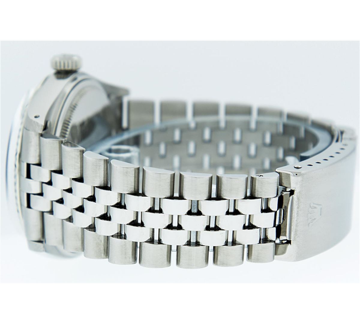 One Gents Rolex Datejust Polished, Serviced & Electronically Tested, Stainless Steel Case:36mm, Stainless Steel Crown, Custom Bezel: 18K White Gold Fluted Bezel. Custom Crystal: Acrylic Cyclops Lens. Movement: Automatic Winding Movement Caliber 3035. Custom Dial: Mother Of Pearl With Diamond Hour Markers, Diamond Count: 10 Diamonds In Dial, Clarity: SI-VS, Color: G to H. Date Window: 3 O'Clock Position Date Display, Quickset, Model: 16014 Condition: G-6 Extra Fine. Bracelet: Stainless Steel Jubilee. Bright Polish & Satin Finish. 6.5 Inch Length, Adjustable. Standard Clasp, With Rolex Logo.