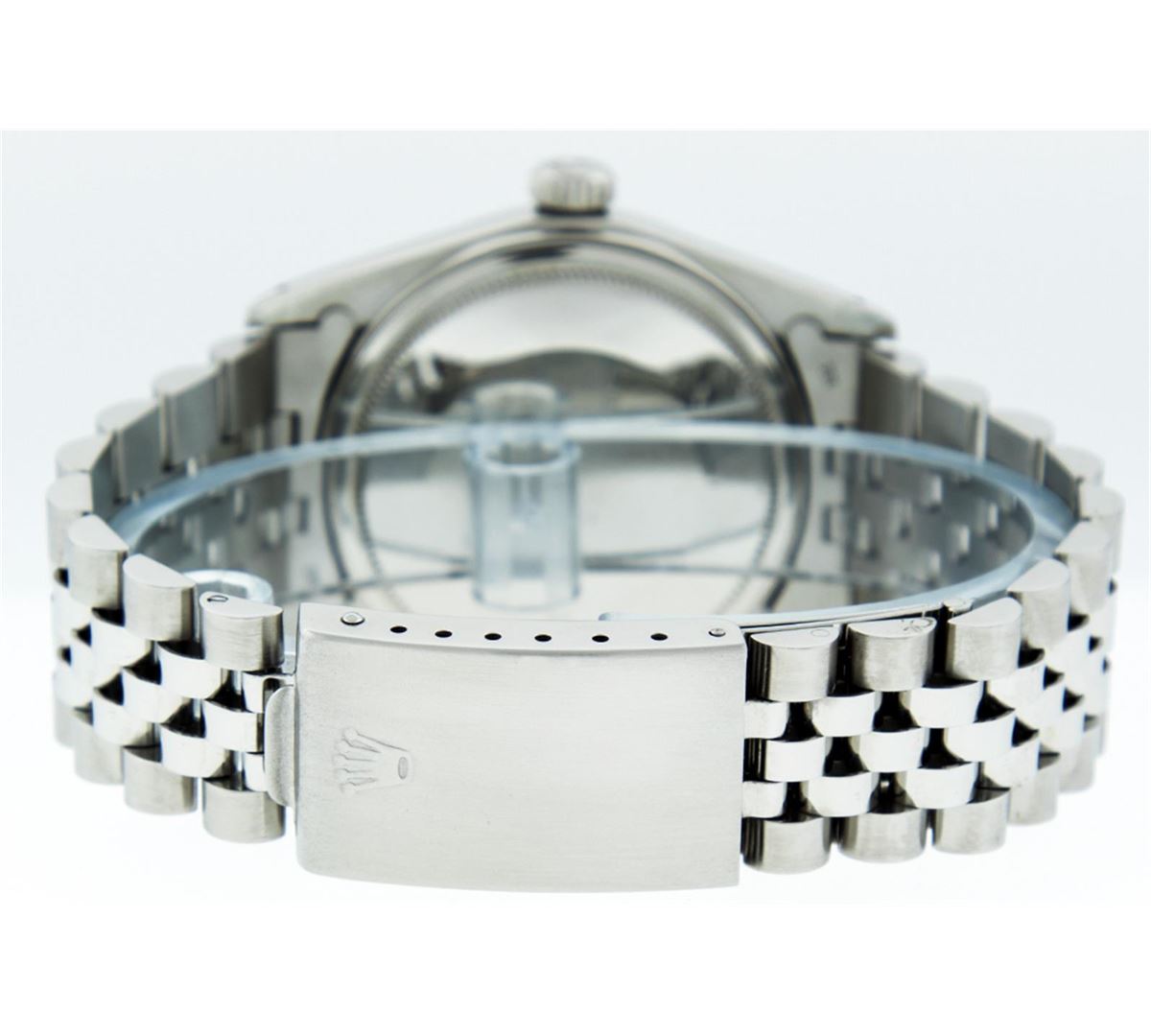 One Gents Rolex Datejust Polished, Serviced & Electronically Tested, Stainless Steel Case:36mm, Stainless Steel Crown, Custom Bezel: 18K White Gold Fluted Bezel. Custom Crystal: Acrylic Cyclops Lens. Movement: Automatic Winding Movement Caliber 3035. Custom Dial: Mother Of Pearl With Diamond Hour Markers, Diamond Count: 10 Diamonds In Dial, Clarity: SI-VS, Color: G to H. Date Window: 3 O'Clock Position Date Display, Quickset, Model: 16014 Condition: G-6 Extra Fine. Bracelet: Stainless Steel Jubilee. Bright Polish & Satin Finish. 6.5 Inch Length, Adjustable. Standard Clasp, With Rolex Logo.