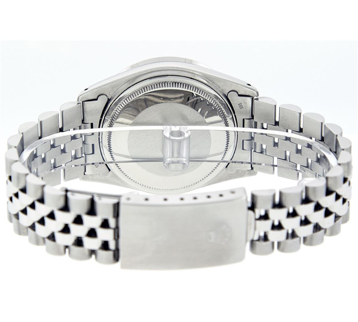 One Mens Rolex Datejust Polished Bright with Satin Finish, Serviced & Electronically Tested, Stainless Steel Case:36mm, Stainless Steel Crown, Custom Bezel: 18K White Gold Pyramid Diamond Bezel, Diamond Count: 24 Diamonds Total Weight .70 Carat, Clarity: SI-VS, Color: G to H. Crystal: Synthetic Sapphire Cyclops Lens. Movement: Automatic Winding Movement Caliber 3135. Custom Dial: Blue Index Dial. Date Window: 3 O'Clock Position Date Display, Quickset, Model: 16234 Condition: G-6 Extra Fine. Bracelet: Stainless Steel Jubilee. Bright Polish & Satin Finish. 6.5 Inch Length, Adjustable. Standard Clasp, With Rolex Logo.