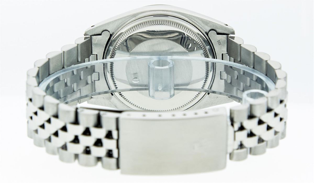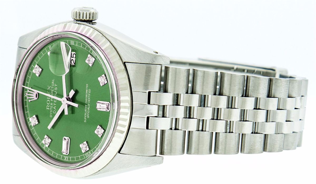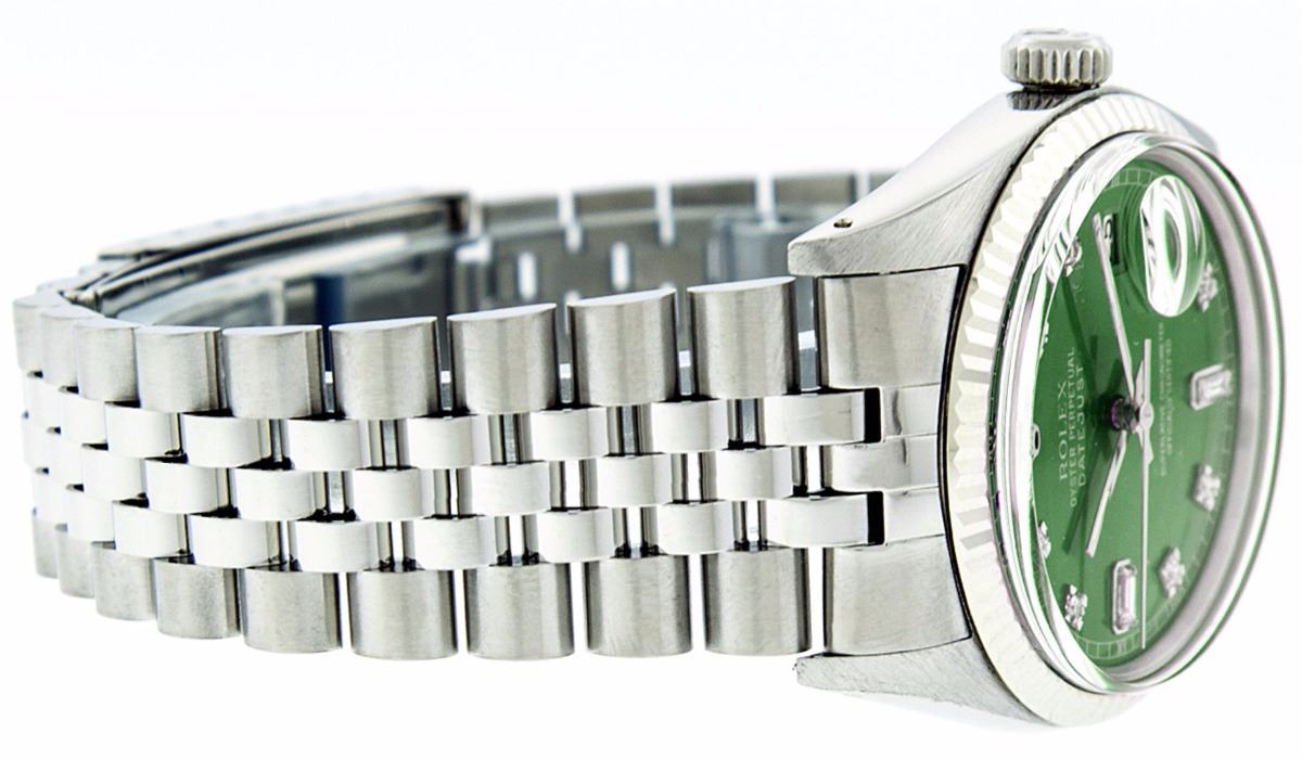One Gents Rolex Datejust Polished, Serviced & Electronically Tested, Stainless Steel Case:36mm, Stainless Steel Crown, Bezel: 18K White Gold Fluted Bezel. Custom Crystal: Acrylic Cyclops Lens. Movement: Automatic Winding Movement Caliber 3035. Custom Dial: Green With Diamond Hour Markers And Square Roman Track Square Setting, Diamond Count: 8 Diamonds + 2 Baguettes, Clarity: SI-VS, Color: G to H. Date Window: 3 O'Clock Position Date Display, Quickset, Model: Datejust Condition: G-6 Extra Fine. Bracelet: Stainless Steel Jubilee. Bright Polish & Satin Finish. 7.0 Inch Length, Adjustable. Standard Clasp, With Rolex Logo. Comes with 6 month warranty.