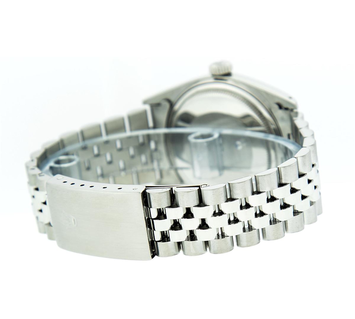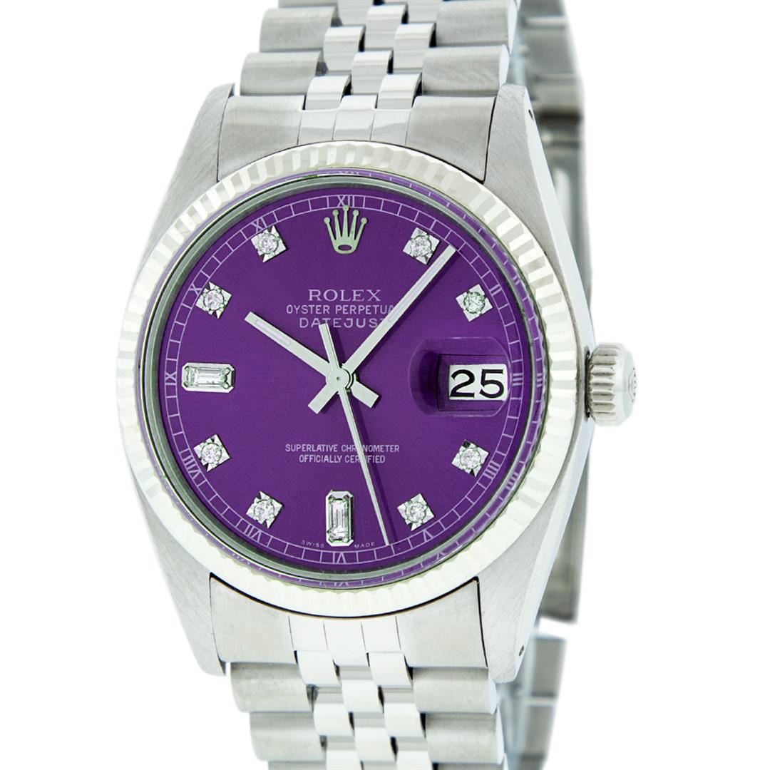 One Gents Rolex Datejust Polished, Serviced & Electronically Tested, Stainless Steel Case:36mm, Stainless Steel Crown, Bezel: 18K White Gold Fluted Bezel. Custom Crystal: Acrylic Cyclops Lens. Movement: Automatic Winding Movement Caliber 3035. Custom Dial: Purple With Diamond Hour Markers And Square Roman Track Square Setting, Diamond Count: 8 Diamonds + 2 Baguettes, Clarity: SI-VS, Color: G to H. Date Window: 3 O'Clock Position Date Display, Quickset, Model: Datejust Condition: G-6 Extra Fine. Bracelet: Stainless Steel Jubilee. Bright Polish & Satin Finish. 7.0 Inch Length, Adjustable. Standard Clasp, With Rolex Logo. Comes with 6 month warranty.
