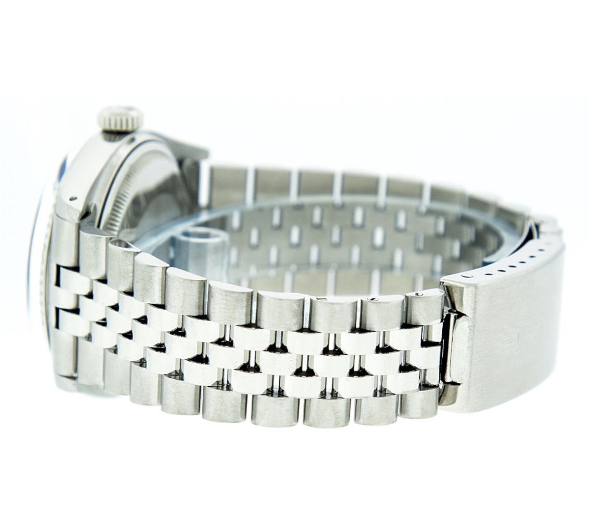 One Gents Rolex Datejust Polished, Serviced & Electronically Tested, Stainless Steel Case:36mm, Stainless Steel Crown, Custom Bezel: 18K White Gold Fluted Bezel. Custom Crystal: Acrylic Cyclops Lens. Movement: Automatic Winding Movement Caliber 3035. Custom Dial: Dark Rhodium With Diamond Hour Markers And Square Roman Track Square Setting, Diamond Count: 8 Diamonds + 2 Baguettes, Clarity: SI-VS, Color: G to H. Date Window: 3 O'Clock Position Date Display, Quickset, Model: Datejust Condition: G-6 Extra Fine. Bracelet: Stainless Steel Jubilee. Bright Polish & Satin Finish. 7.0 Inch Length, Adjustable. Standard Clasp, With Rolex Logo. Comes with 6 month warranty.
