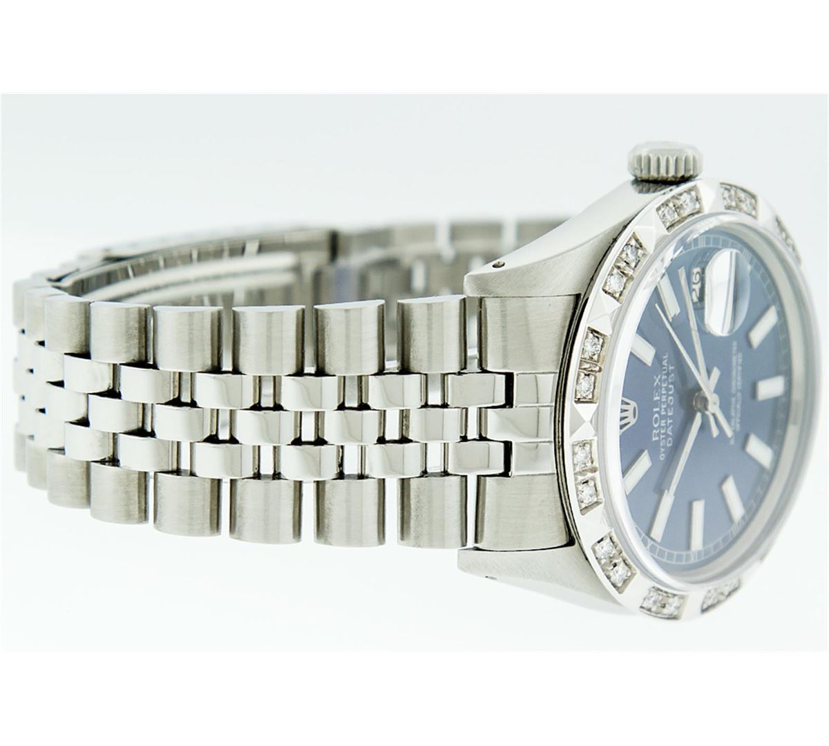 One Mens Rolex Datejust Polished Bright with Satin Finish, Serviced & Electronically Tested, Stainless Steel Case:36mm, Stainless Steel Crown, Custom Bezel: 18K White Gold Pyramid Diamond Bezel, Diamond Count: 24 Diamonds Total Weight .70 Carat, Clarity: SI-VS, Color: G to H. Crystal: Synthetic Sapphire Cyclops Lens. Movement: Automatic Winding Movement Caliber 3135. Custom Dial: Blue Index Dial. Date Window: 3 O'Clock Position Date Display, Quickset, Model: 16234 Condition: G-6 Extra Fine. Bracelet: Stainless Steel Jubilee. Bright Polish & Satin Finish. 6.5 Inch Length, Adjustable. Standard Clasp, With Rolex Logo.