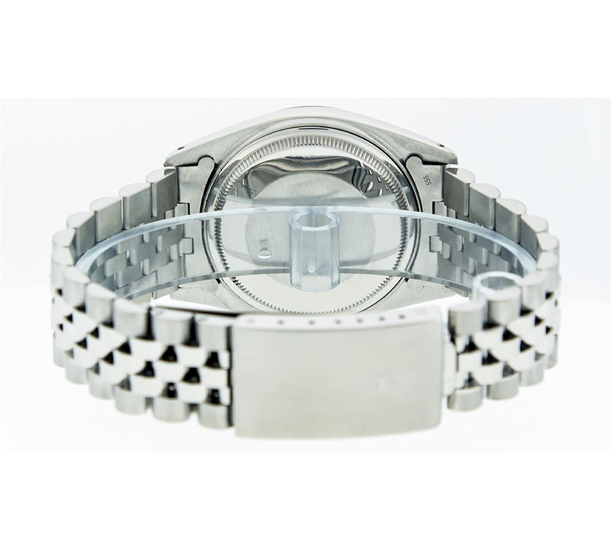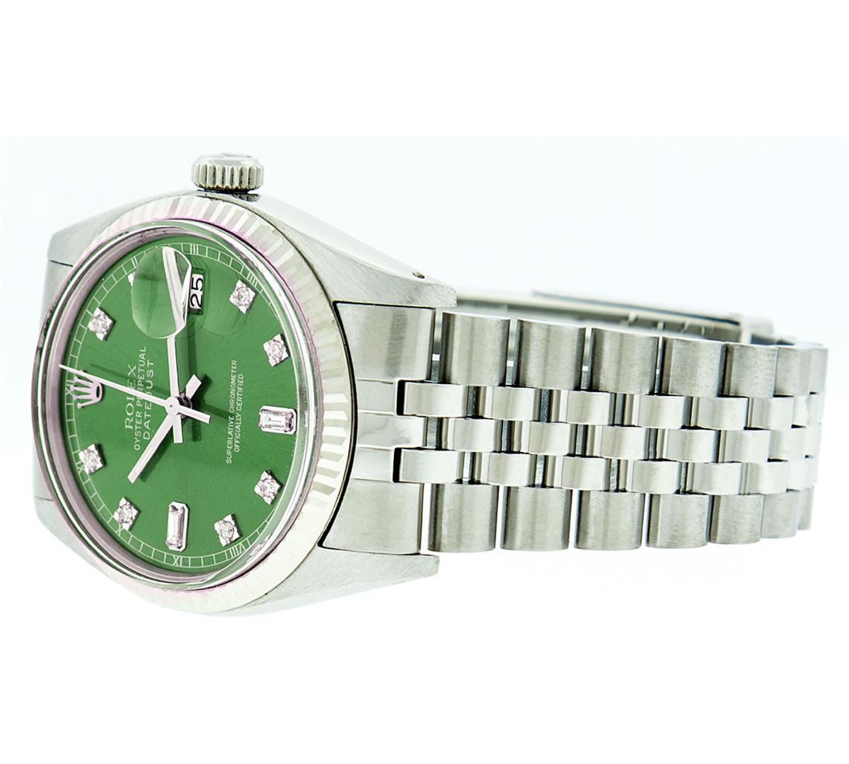 One Gents Rolex Datejust Polished, Serviced & Electronically Tested, Stainless Steel Case:36mm, Stainless Steel Crown, Bezel: 18K White Gold Fluted Bezel. Custom Crystal: Acrylic Cyclops Lens. Movement: Automatic Winding Movement Caliber 3035. Custom Dial: Green With Diamond Hour Markers And Square Roman Track Square Setting, Diamond Count: 8 Diamonds + 2 Baguettes, Clarity: SI-VS, Color: G to H. Date Window: 3 O'Clock Position Date Display, Quickset, Model: Datejust Condition: G-6 Extra Fine. Bracelet: Stainless Steel Jubilee. Bright Polish & Satin Finish. 7.0 Inch Length, Adjustable. Standard Clasp, With Rolex Logo. Comes with 6 month warranty.