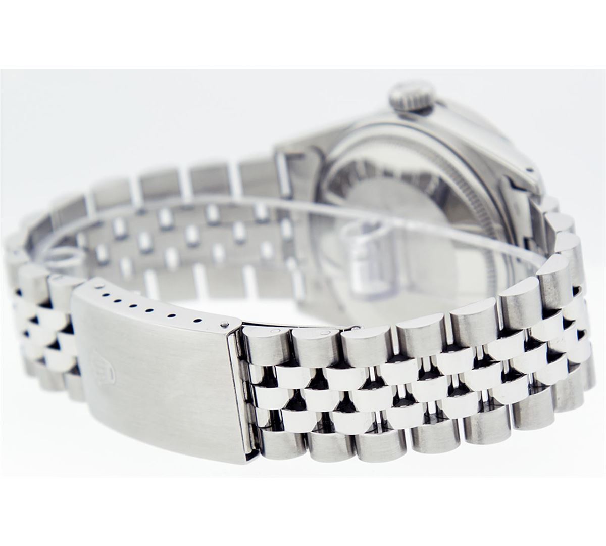 One Mens Rolex Datejust Polished Bright with Satin Finish, Serviced & Electronically Tested, Stainless Steel Case:36mm, Stainless Steel Crown, Custom Bezel: 18K White Gold Pyramid Diamond Bezel, Diamond Count: 24 Diamonds Total Weight .70 Carat, Clarity: SI-VS, Color: G to H. Crystal: Synthetic Sapphire Cyclops Lens. Movement: Automatic Winding Movement Caliber 3135. Custom Dial: Blue Index Dial. Date Window: 3 O'Clock Position Date Display, Quickset, Model: 16234 Condition: G-6 Extra Fine. Bracelet: Stainless Steel Jubilee. Bright Polish & Satin Finish. 6.5 Inch Length, Adjustable. Standard Clasp, With Rolex Logo.