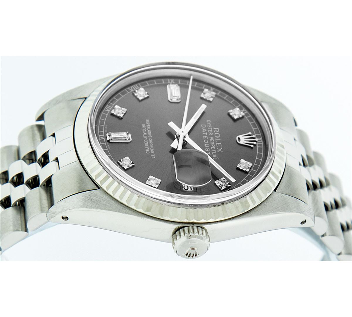 One Gents Rolex Datejust Polished, Serviced & Electronically Tested, Stainless Steel Case:36mm, Stainless Steel Crown, Custom Bezel: 18K White Gold Fluted Bezel. Custom Crystal: Acrylic Cyclops Lens. Movement: Automatic Winding Movement Caliber 3035. Custom Dial: Dark Rhodium With Diamond Hour Markers And Square Roman Track Square Setting, Diamond Count: 8 Diamonds + 2 Baguettes, Clarity: SI-VS, Color: G to H. Date Window: 3 O'Clock Position Date Display, Quickset, Model: Datejust Condition: G-6 Extra Fine. Bracelet: Stainless Steel Jubilee. Bright Polish & Satin Finish. 7.0 Inch Length, Adjustable. Standard Clasp, With Rolex Logo. Comes with 6 month warranty.