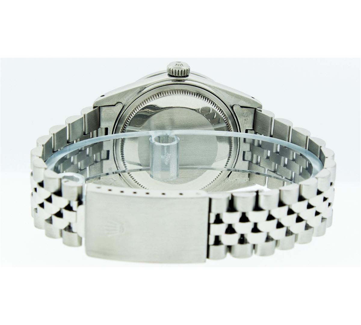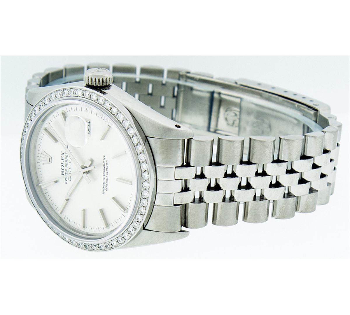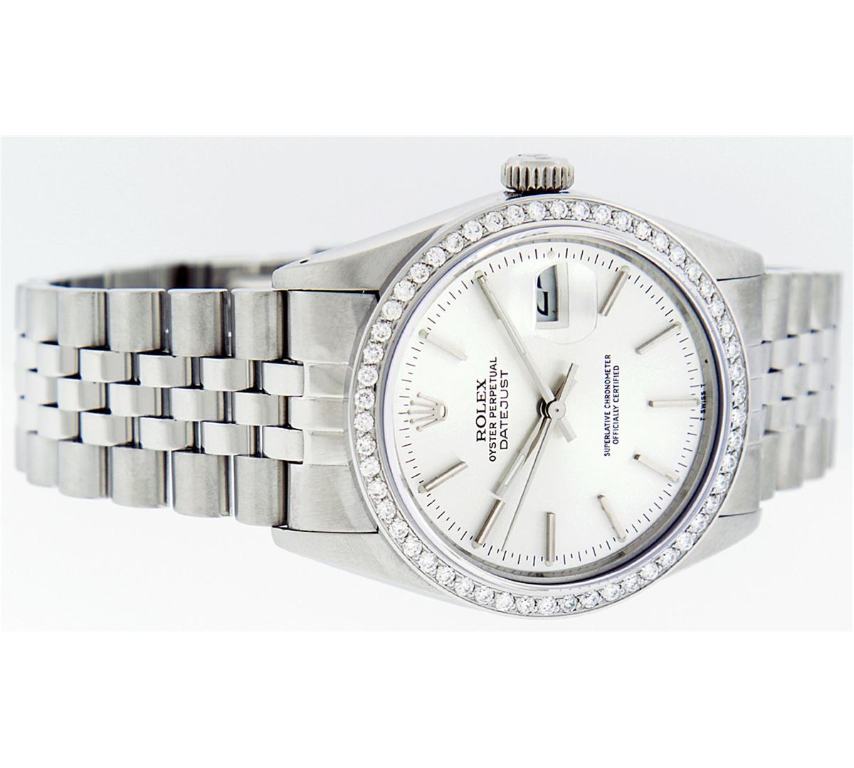 One Mens Rolex Datejust Polished Bright with Satin Finish, Serviced & Electronically Tested, Stainless Steel Case:36mm, Stainless Steel Crown, Custom Bezel: Stainless Steel Beadset Diamond Bezel, Diamond Count: 54 Diamonds Total Weight 1.00 Carat, Clarity: SI-VS, Color: G to H. Custom Crystal: Synthetic Sapphire Cyclops Lens. Movement: Automatic Winding Movement Caliber 3035. Dial: Silver Index Dial With Small Track And Lumi Dots. Date Window: 3 O'Clock Position Date Display, Quickset, Model: Datejust. Condition: G-6 Extra Fine. Bracelet: Stainless Steel Jubilee. Bright Polish & Satin Finish. 7.0 Inch Length, Adjustable. Standard Clasp, With Rolex Logo. Comes with 6 month warranty.