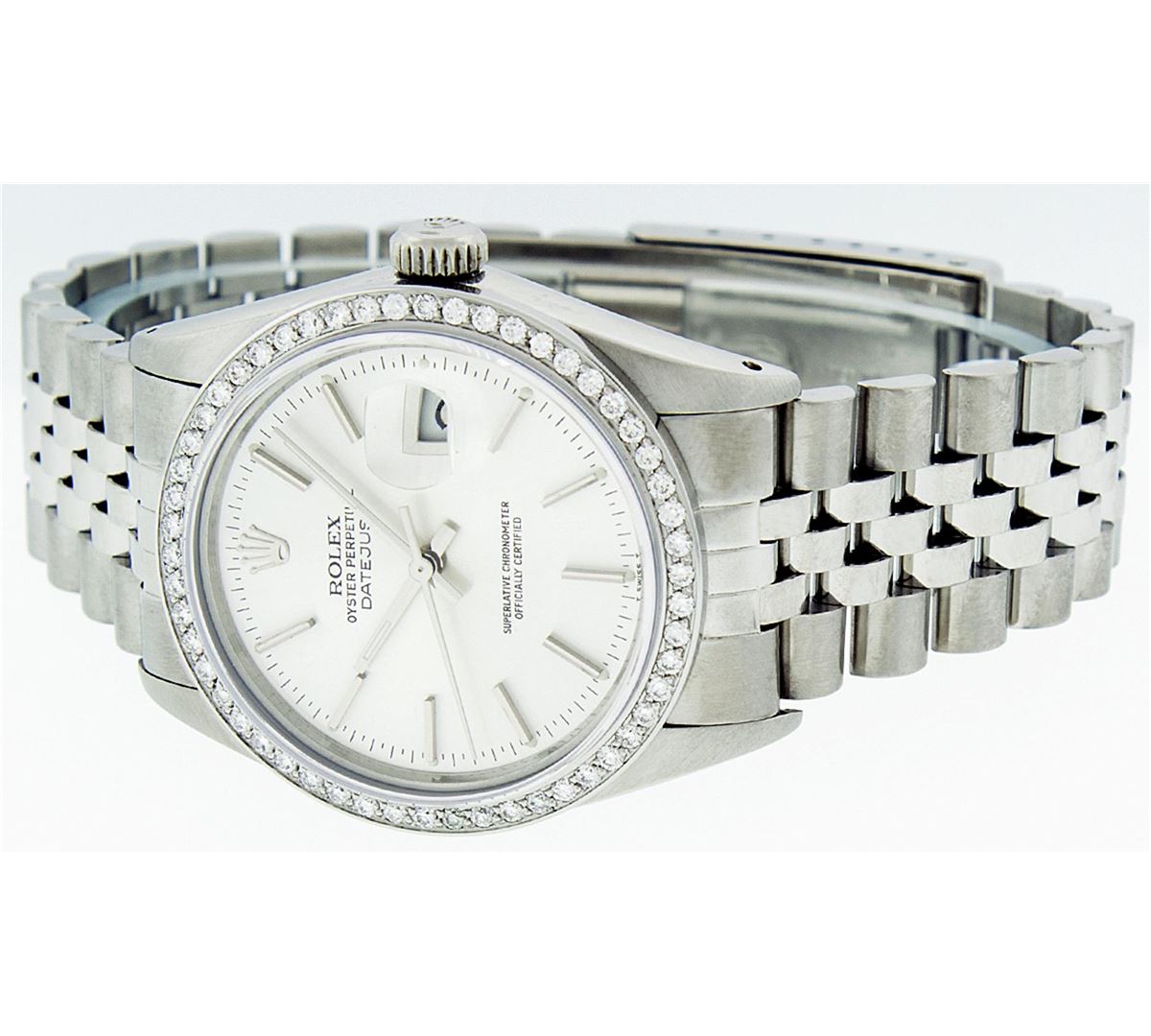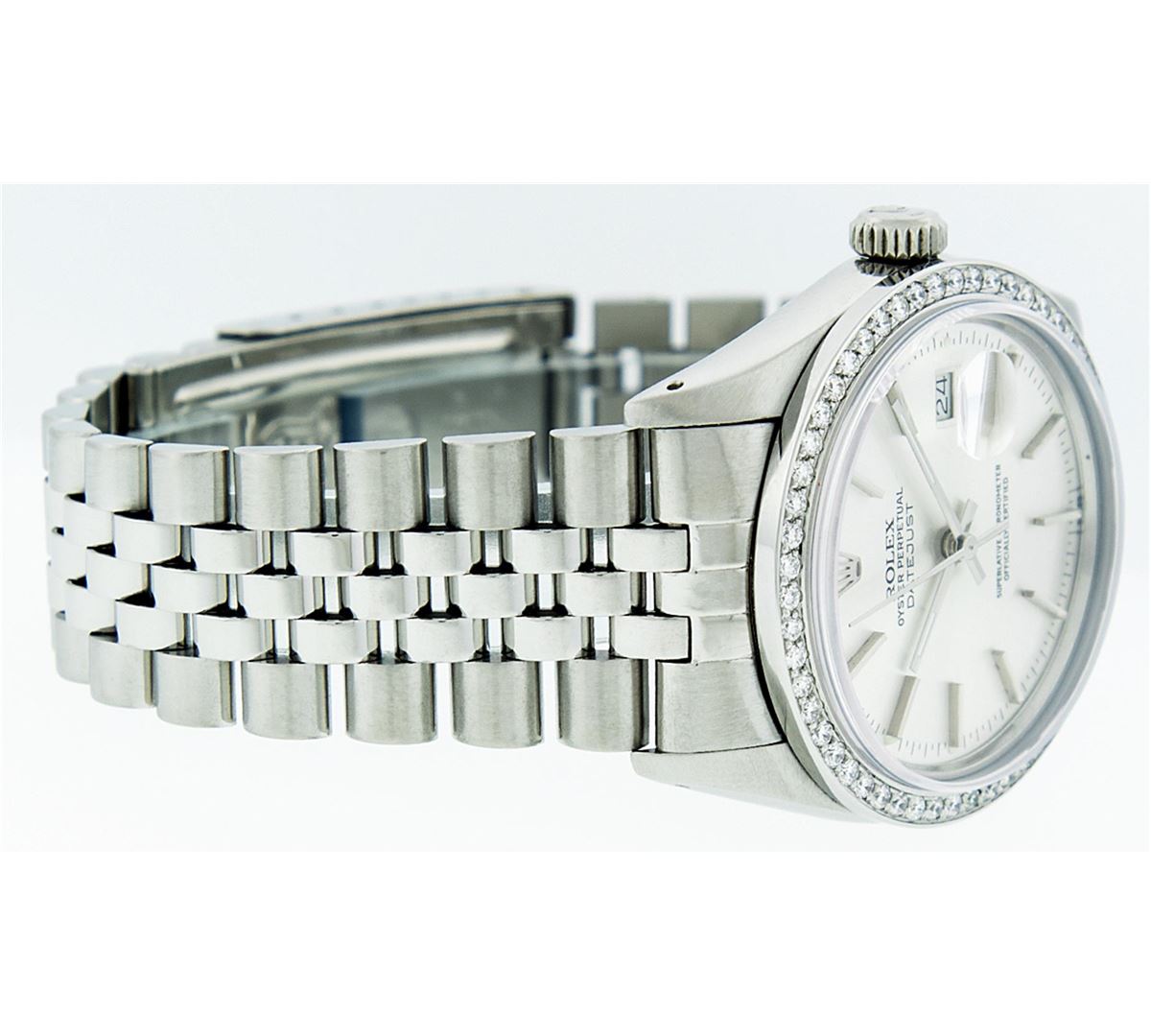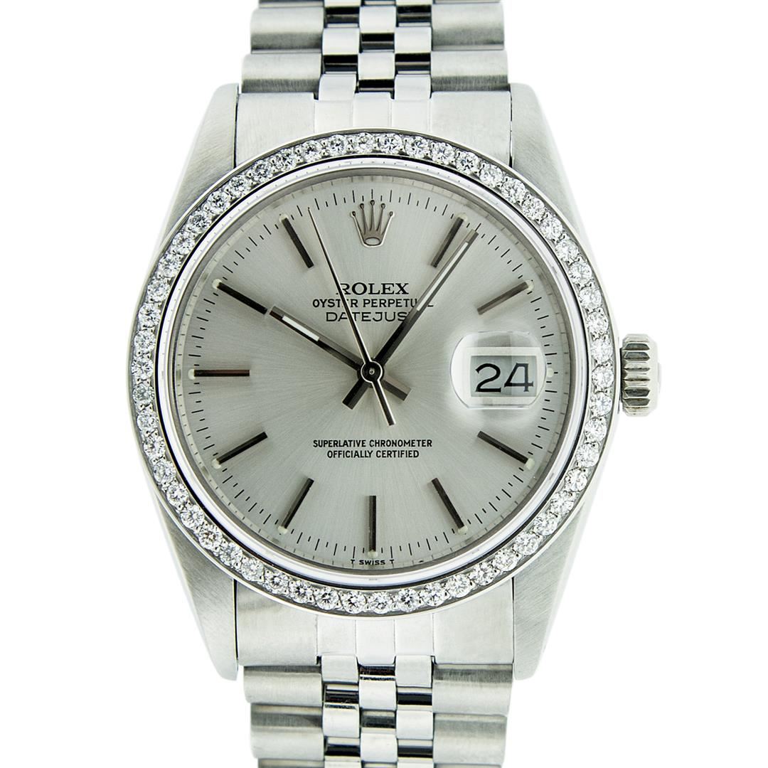 One Mens Rolex Datejust Polished Bright with Satin Finish, Serviced & Electronically Tested, Stainless Steel Case:36mm, Stainless Steel Crown, Custom Bezel: Stainless Steel Beadset Diamond Bezel, Diamond Count: 54 Diamonds Total Weight 1.00 Carat, Clarity: SI-VS, Color: G to H. Custom Crystal: Synthetic Sapphire Cyclops Lens. Movement: Automatic Winding Movement Caliber 3035. Dial: Silver Index Dial With Small Track And Lumi Dots. Date Window: 3 O'Clock Position Date Display, Quickset, Model: Datejust. Condition: G-6 Extra Fine. Bracelet: Stainless Steel Jubilee. Bright Polish & Satin Finish. 7.0 Inch Length, Adjustable. Standard Clasp, With Rolex Logo. Comes with 6 month warranty.