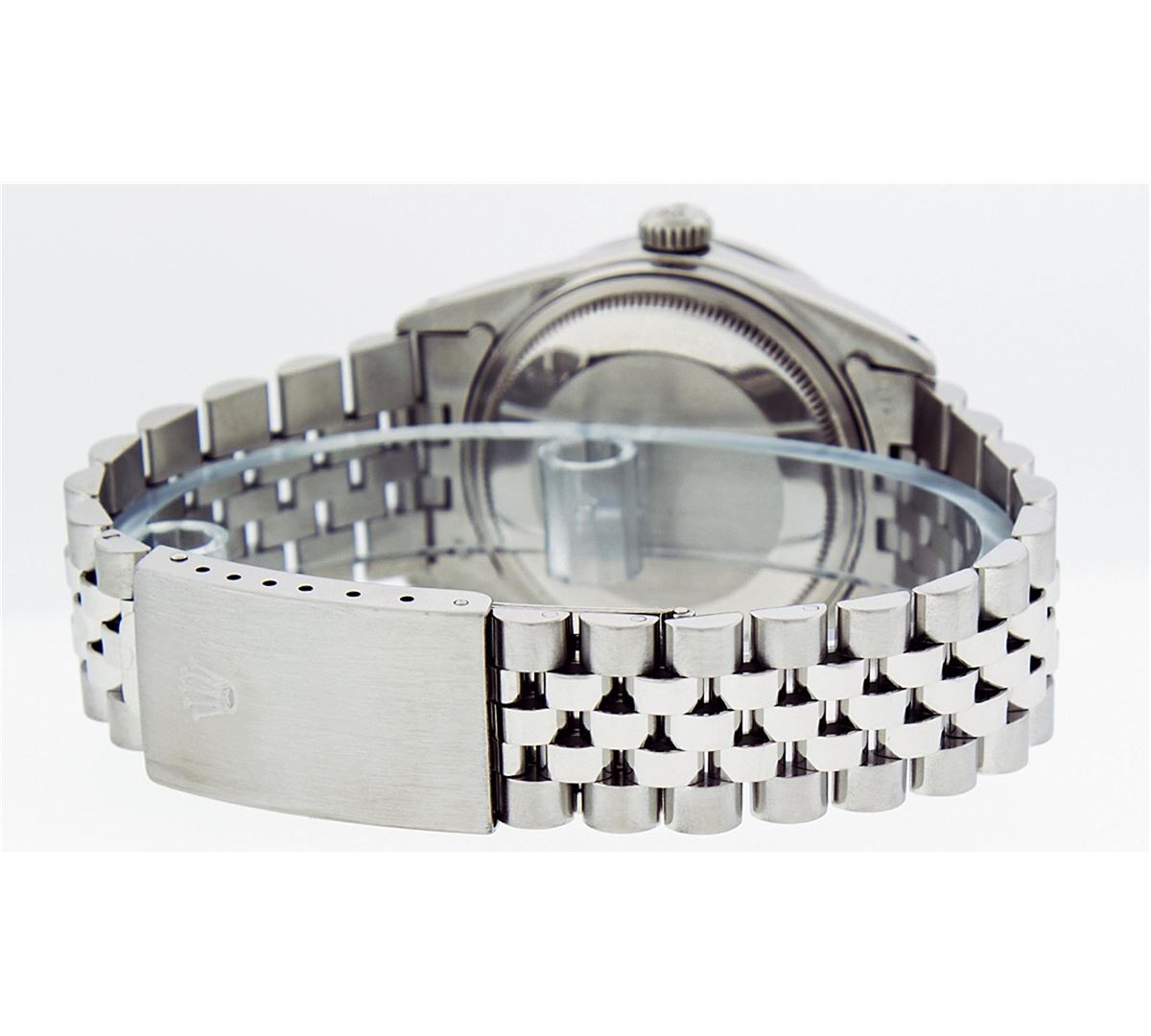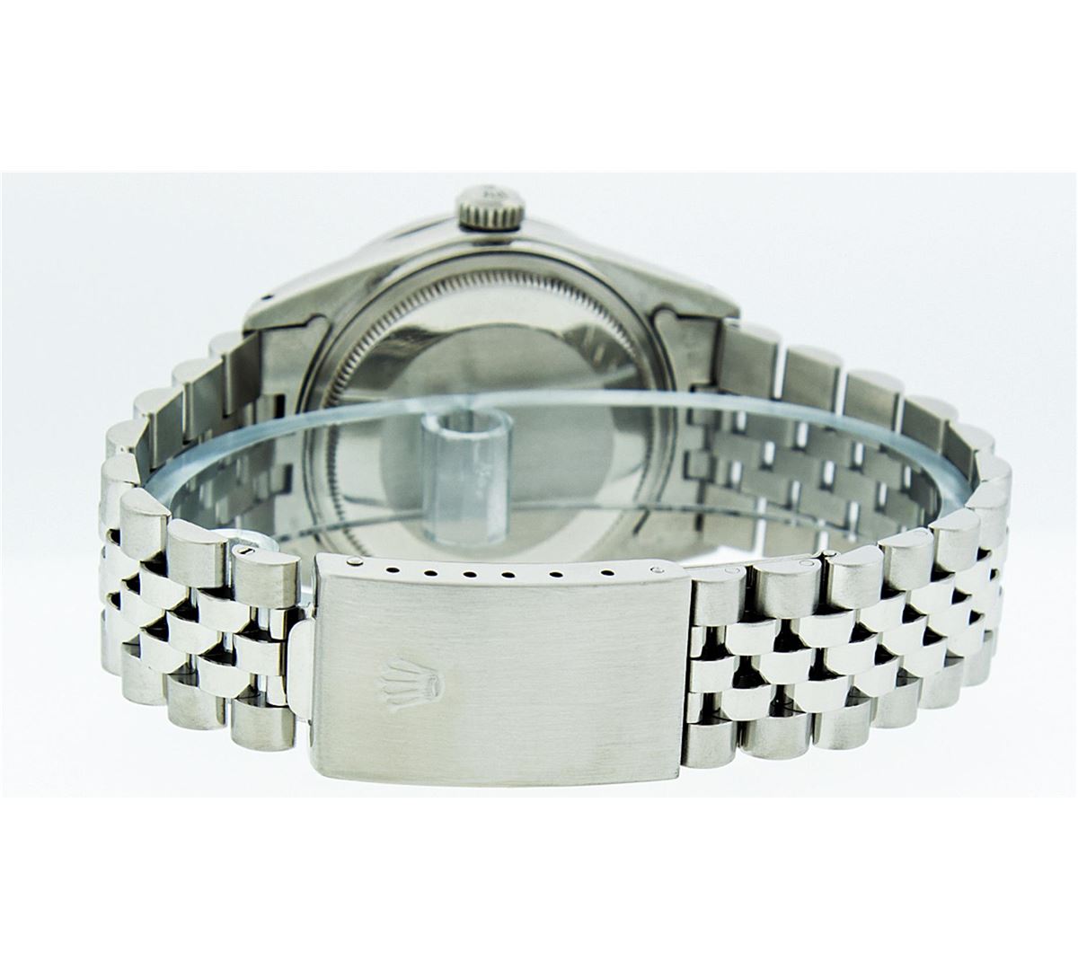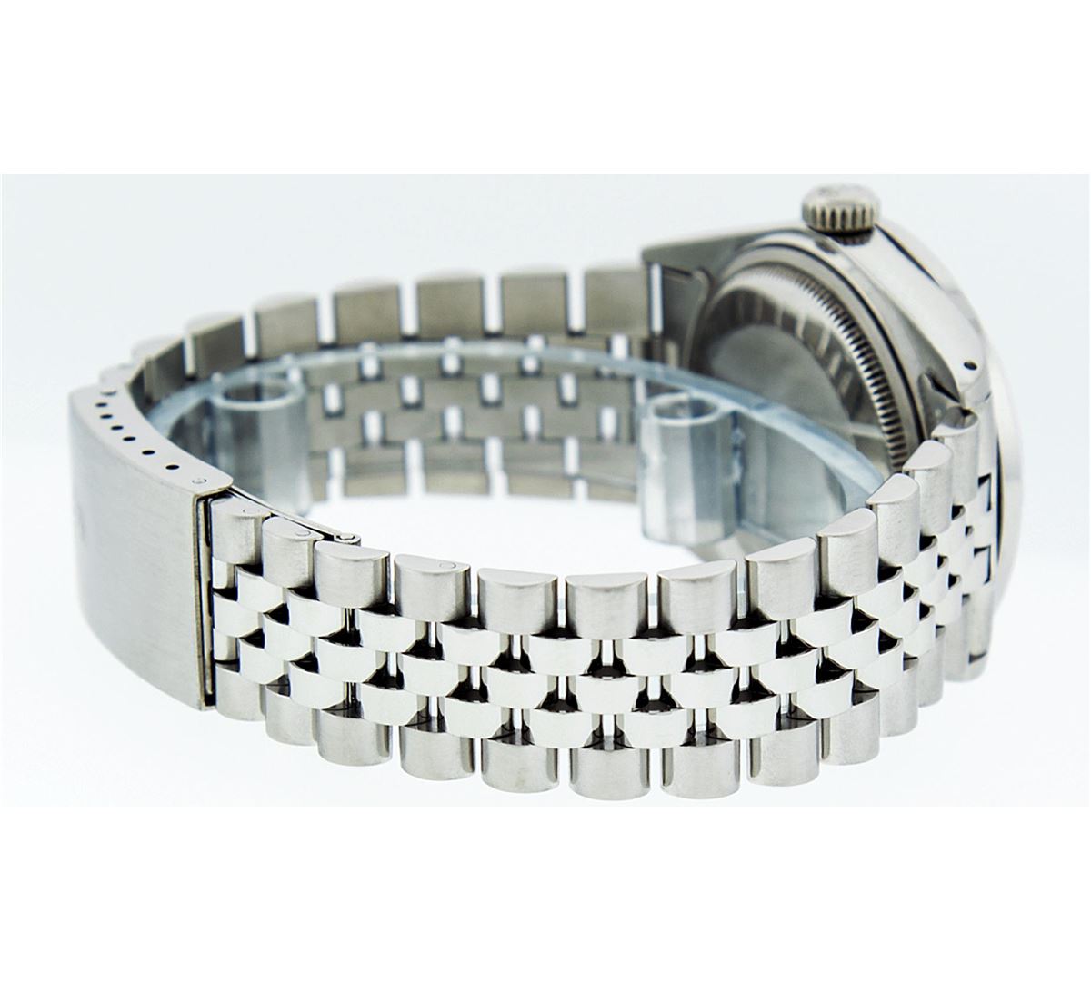 One Mens Rolex Datejust Polished Bright with Satin Finish, Serviced & Electronically Tested, Stainless Steel Case:36mm, Stainless Steel Crown, Custom Bezel: Stainless Steel Beadset Diamond Bezel, Diamond Count: 54 Diamonds Total Weight 1.00 Carat, Clarity: SI-VS, Color: G to H. Custom Crystal: Synthetic Sapphire Cyclops Lens. Movement: Automatic Winding Movement Caliber 3035. Dial: Silver Index Dial With Small Track And Lumi Dots. Date Window: 3 O'Clock Position Date Display, Quickset, Model: Datejust. Condition: G-6 Extra Fine. Bracelet: Stainless Steel Jubilee. Bright Polish & Satin Finish. 7.0 Inch Length, Adjustable. Standard Clasp, With Rolex Logo. Comes with 6 month warranty.