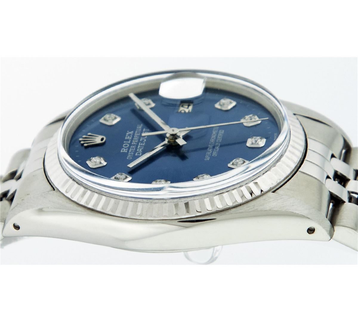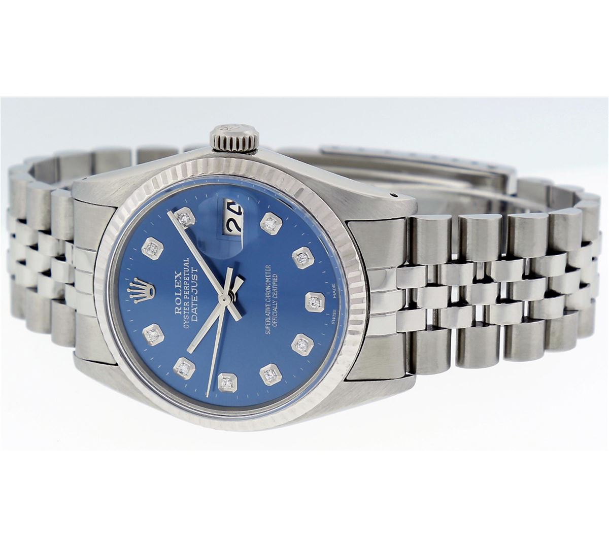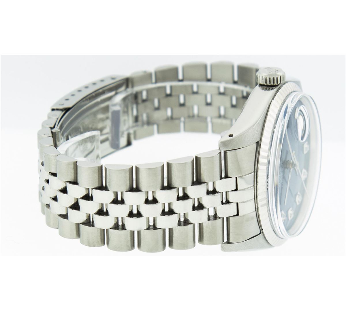 One Gents Rolex Datejust Polished, Serviced & Electronically Tested, Stainless Steel Case:36mm, Stainless Steel Crown, Bezel: 18K White Gold Fluted Bezel. Custom Crystal: Acrylic Cyclops Lens. Movement: Automatic Winding Movement Caliber 3035. Custom Dial: Blue Dial With Diamond Hour Markers And Line Track, Diamond Count: 10 Diamonds, Clarity: SI-VS, Color: G To H. Date Window: 3 O'Clock Position Date Display, Quickset, Model: Datejust Condition: G-6 Extra Fine. Bracelet: Stainless Steel Jubilee. Bright Polish & Satin Finish. 7 Inch Length, Adjustable. Standard Clasp, With Rolex Logo.