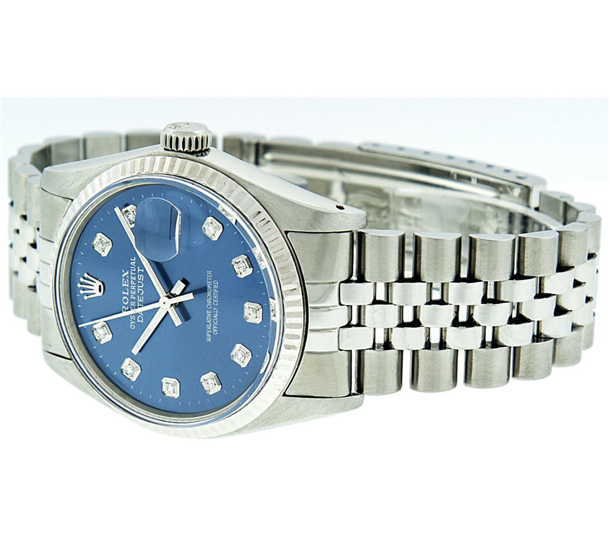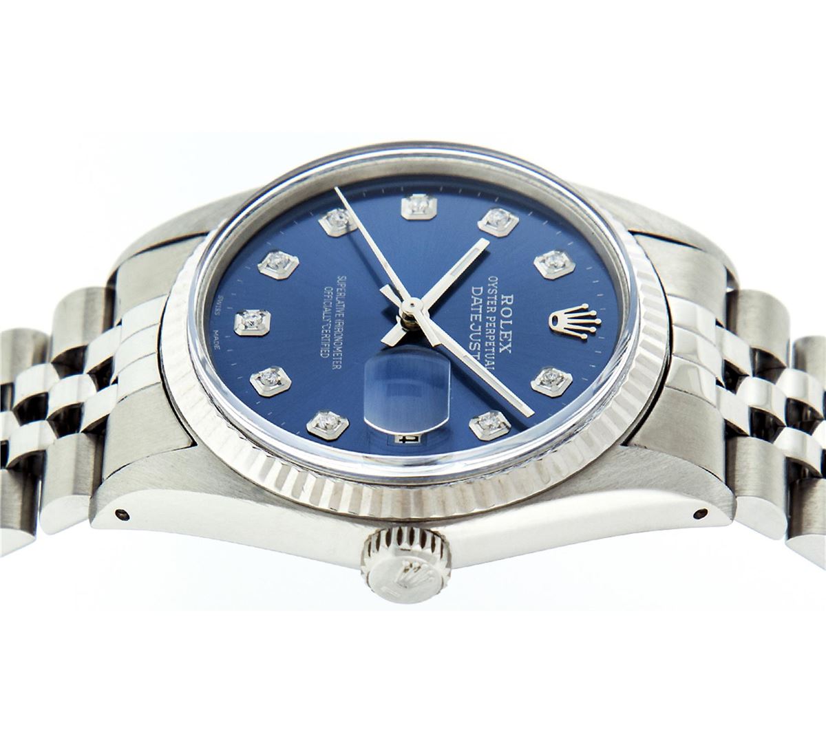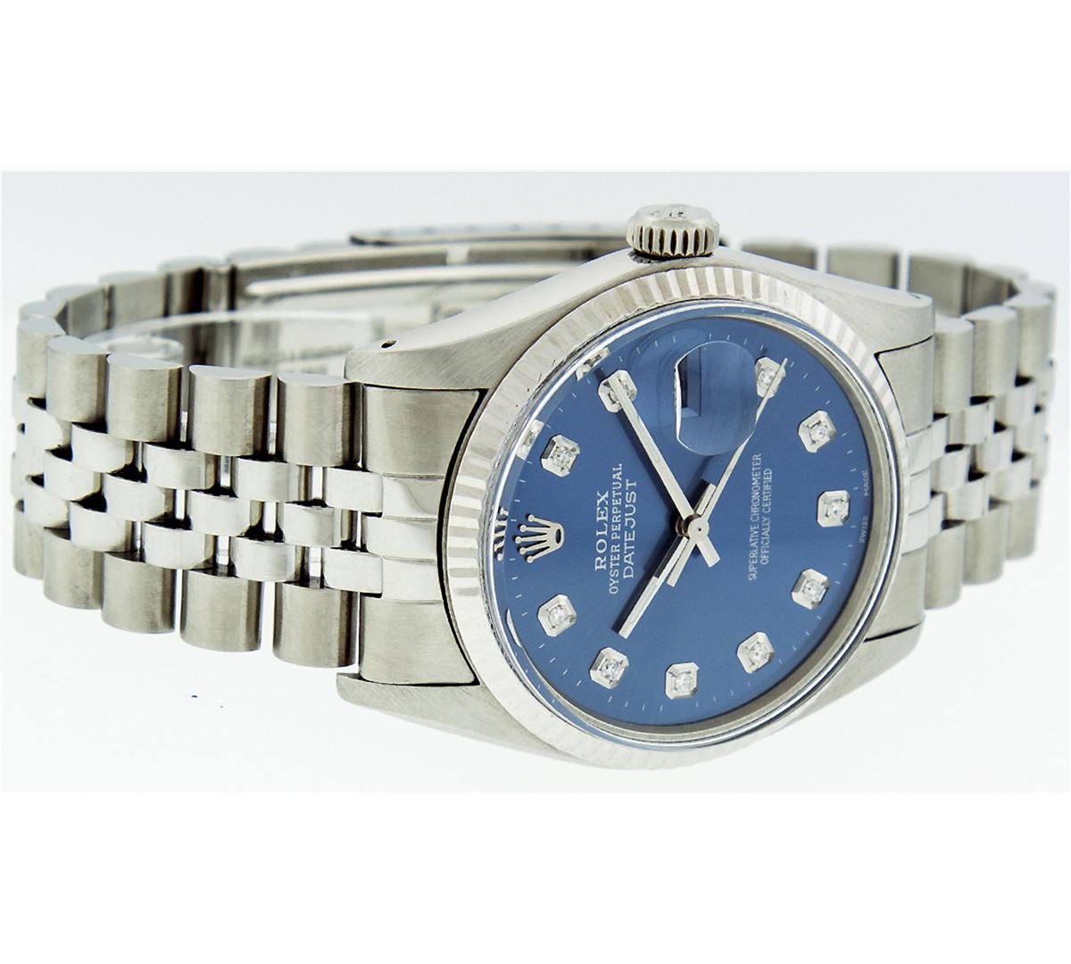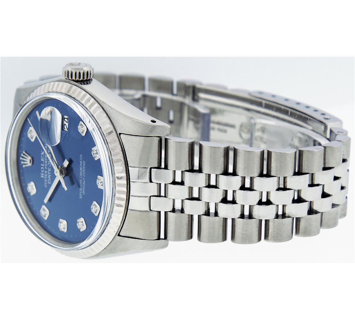 One Gents Rolex Datejust Polished, Serviced & Electronically Tested, Stainless Steel Case:36mm, Stainless Steel Crown, Bezel: 18K White Gold Fluted Bezel. Custom Crystal: Acrylic Cyclops Lens. Movement: Automatic Winding Movement Caliber 3035. Custom Dial: Blue Dial With Diamond Hour Markers And Line Track, Diamond Count: 10 Diamonds, Clarity: SI-VS, Color: G To H. Date Window: 3 O'Clock Position Date Display, Quickset, Model: Datejust Condition: G-6 Extra Fine. Bracelet: Stainless Steel Jubilee. Bright Polish & Satin Finish. 7 Inch Length, Adjustable. Standard Clasp, With Rolex Logo.